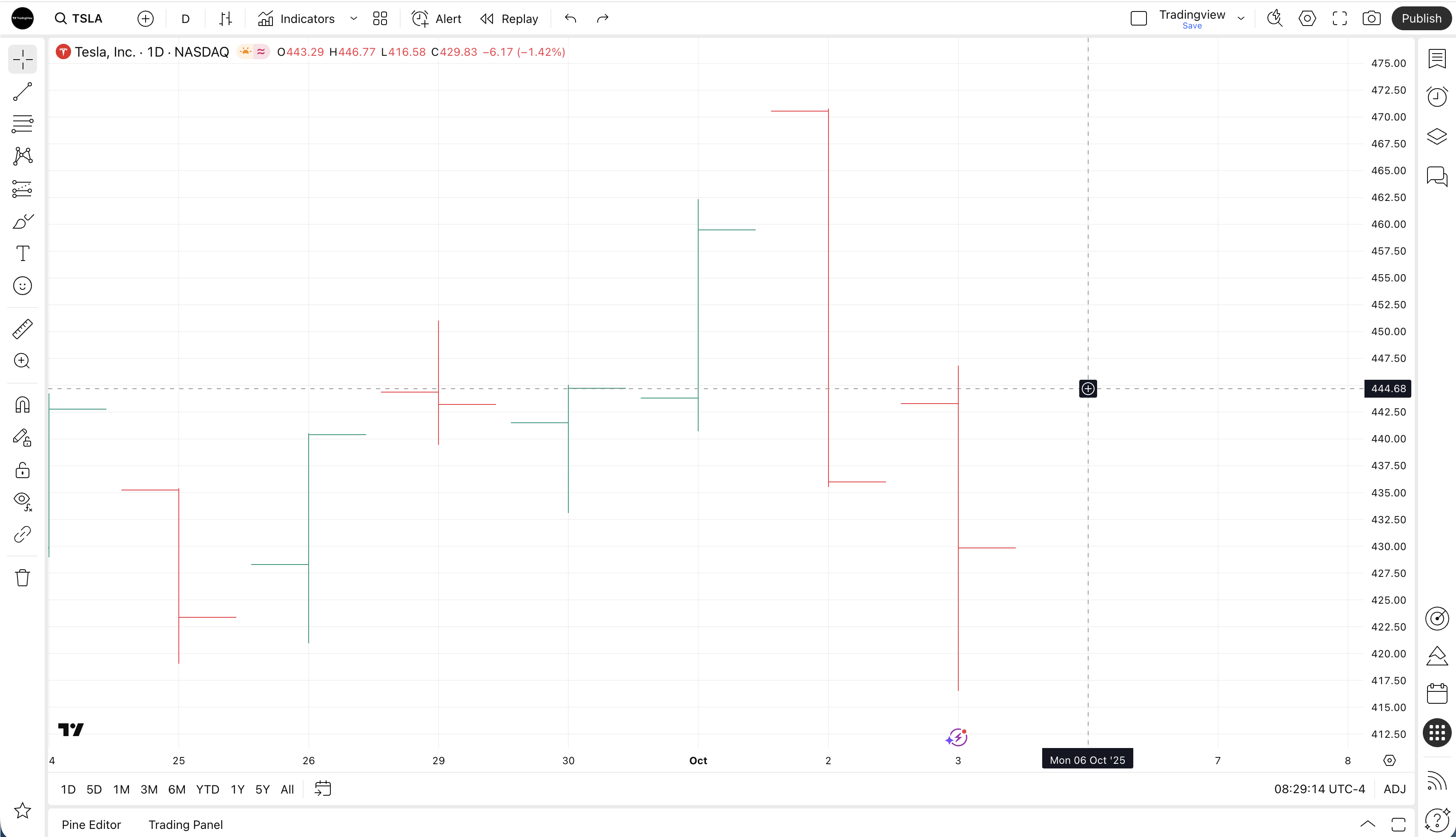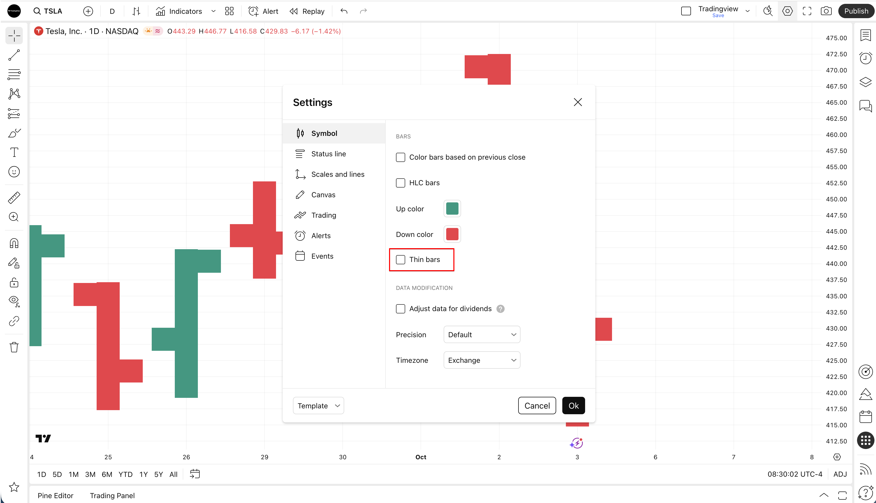 In our thin bars mode, the opening and closing price notches are accurately drawn at the corresponding levels. When the thin bars mode is disabled, a small horizontal line can cross several price values.