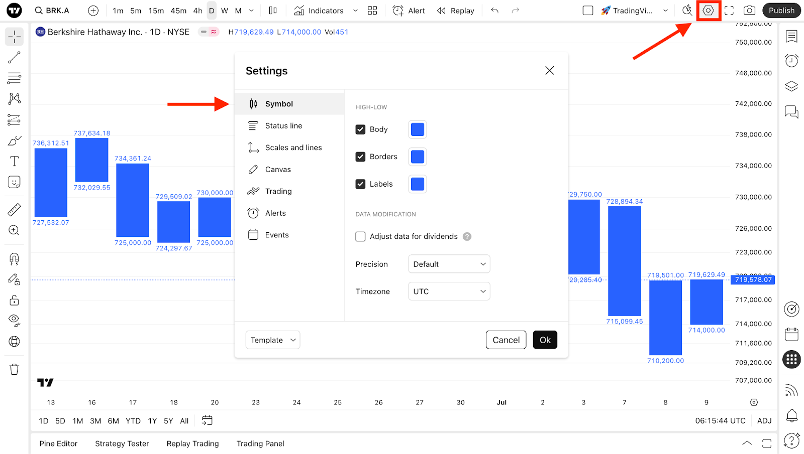To do that, find the gear button on the upper toolbar, and go to the "Symbol" tab.