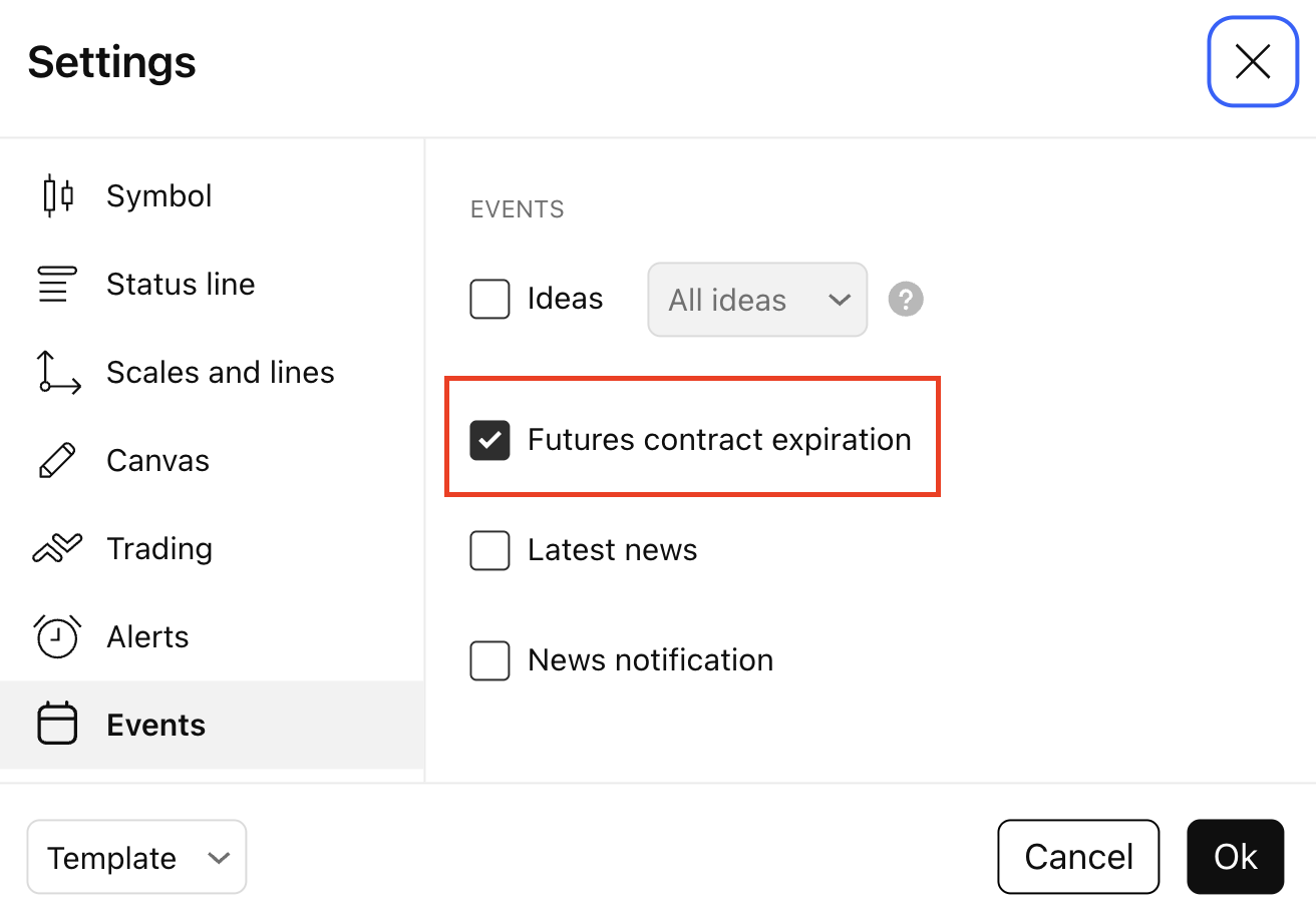 You can enable/disable the display of the expiration icon in the Chart Settings, on the Events tab.