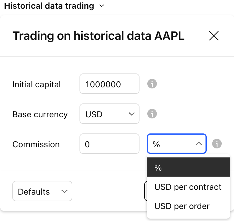 Before pressing the Play button, you can also configure your initial capital, base currency, and commission size in the appropriate menu within the Replay Trading panel. These settings will impact your trading session, so setting them up according to your needs is important.