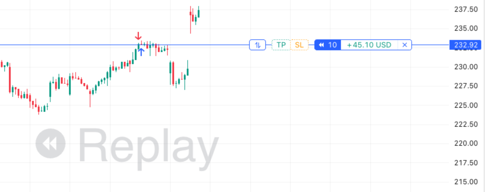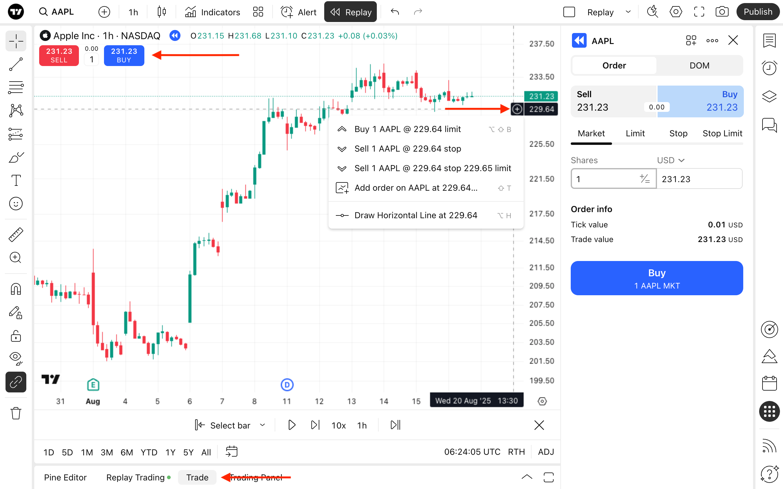 Trading on historical data is available immediately after selecting the starting point. You can open positions and place limit, stop, and stop-limit orders, just like you would with a real broker. To trade, use the Buy and Sell buttons in the top left corner of the chart, the plus menu on the chart, or the Order Ticket, which you can open by clicking Trade.