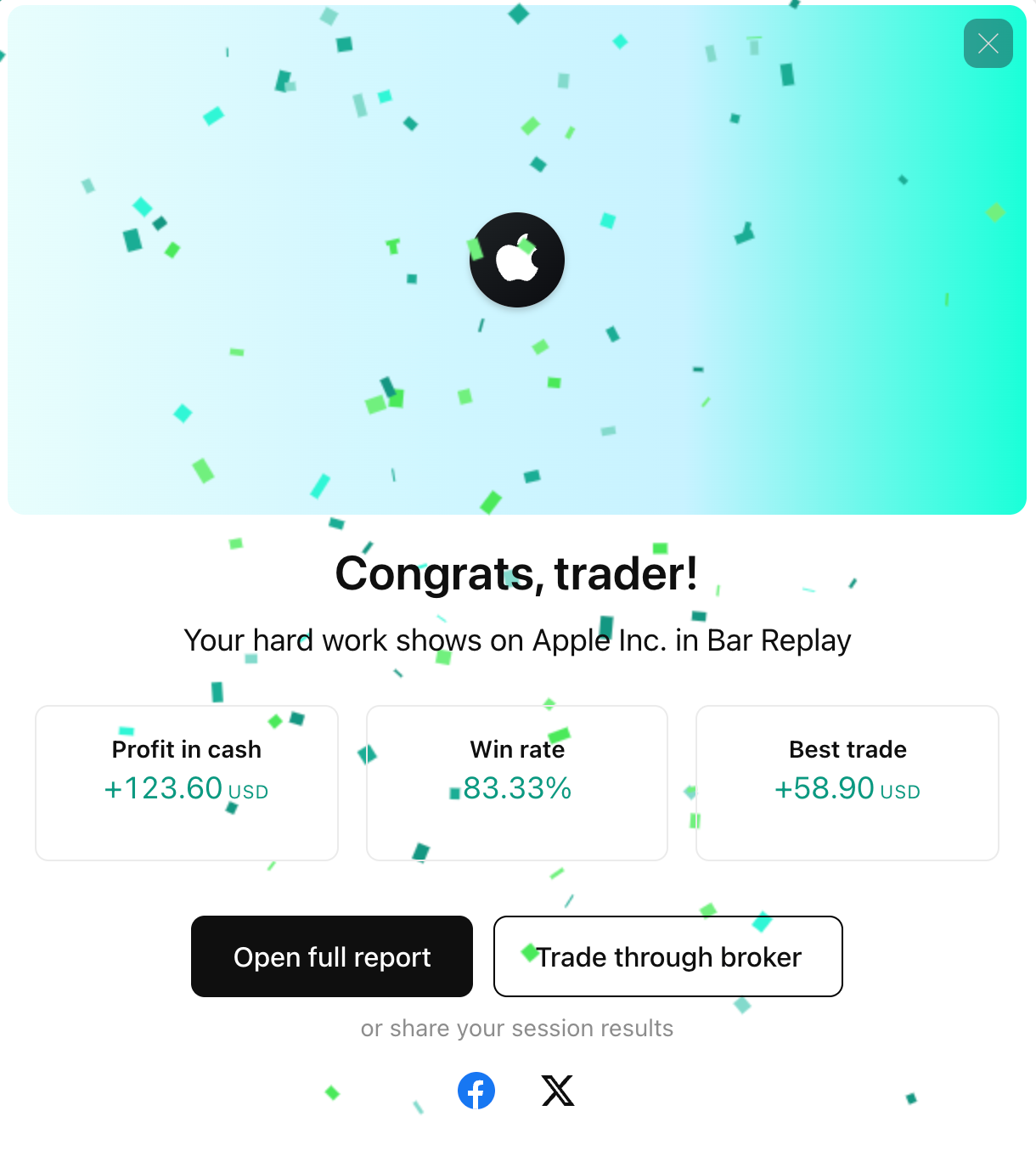 After the end of the replay, if at least one trade is made, a pop-up appears with the trading results for this session. From this pop-up, you can either switch to trading with a real broker or open a full report of your replay session.