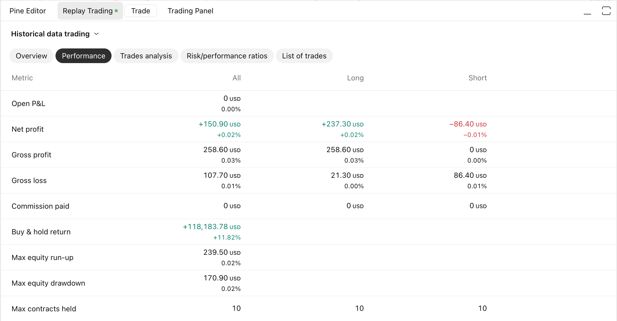 For additional trading statistics, you can check the Overview, Performance, Trades analysis, Risk/performance ratios, and List of trades tabs in the Replay Trading panel. The Performance and List of trades can also be exported for further analysis or record-keeping.