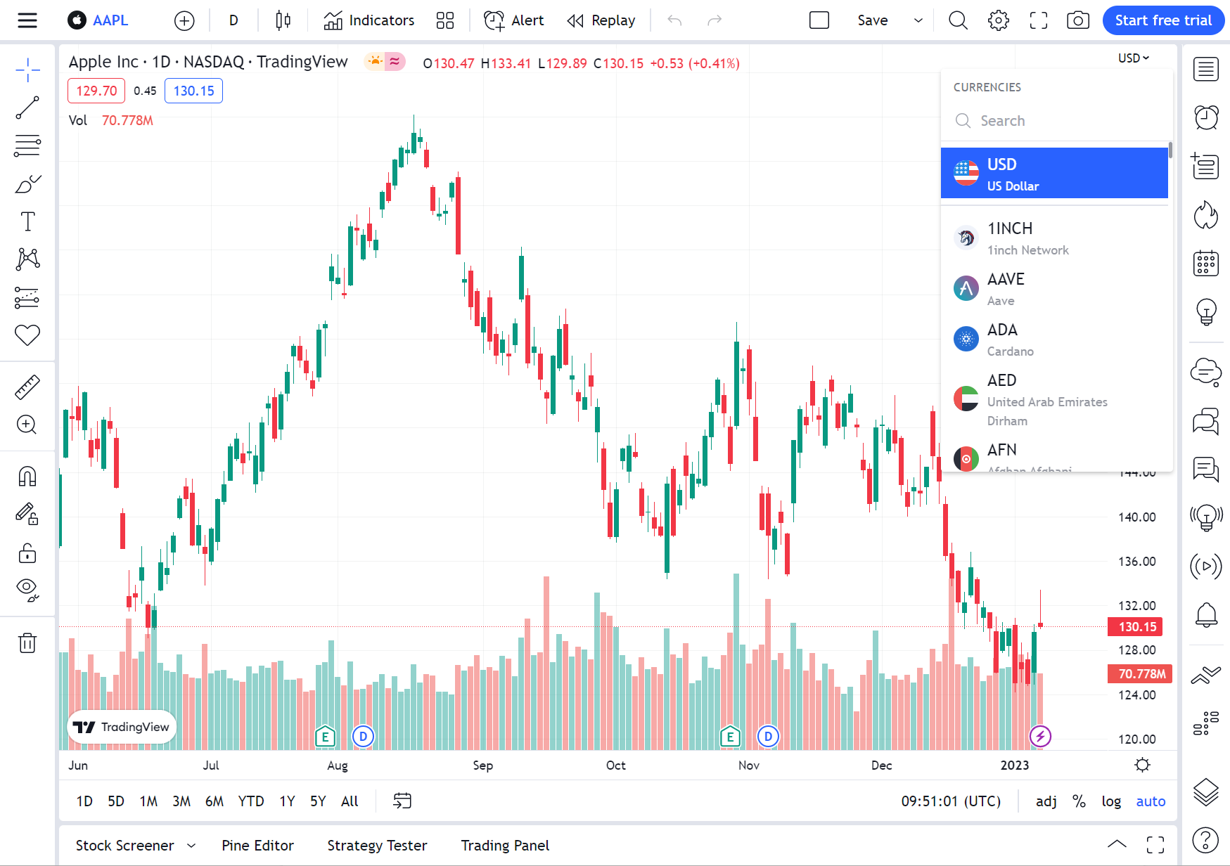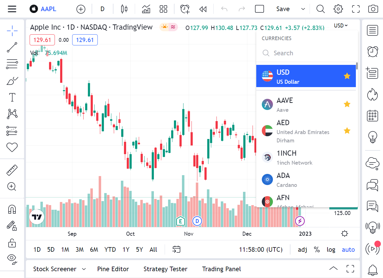 To convert chart data to another currency, click on the currency button at the top of the price scale and select the currency you are interested in from the drop-down list. By default, the button appears when you hover over the scale.