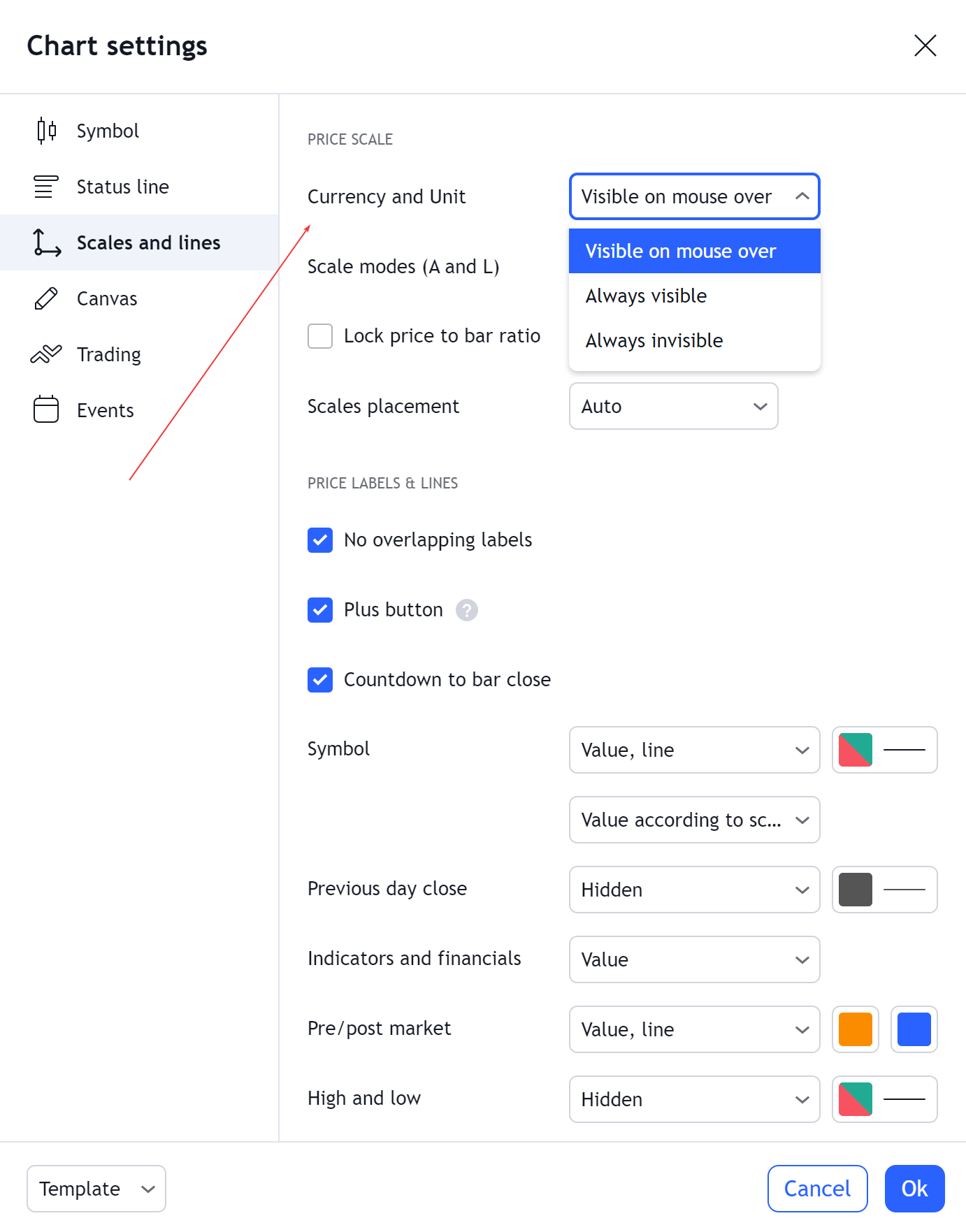 The display mode of the currency change button can be set in the chart settings on the Scales tab.