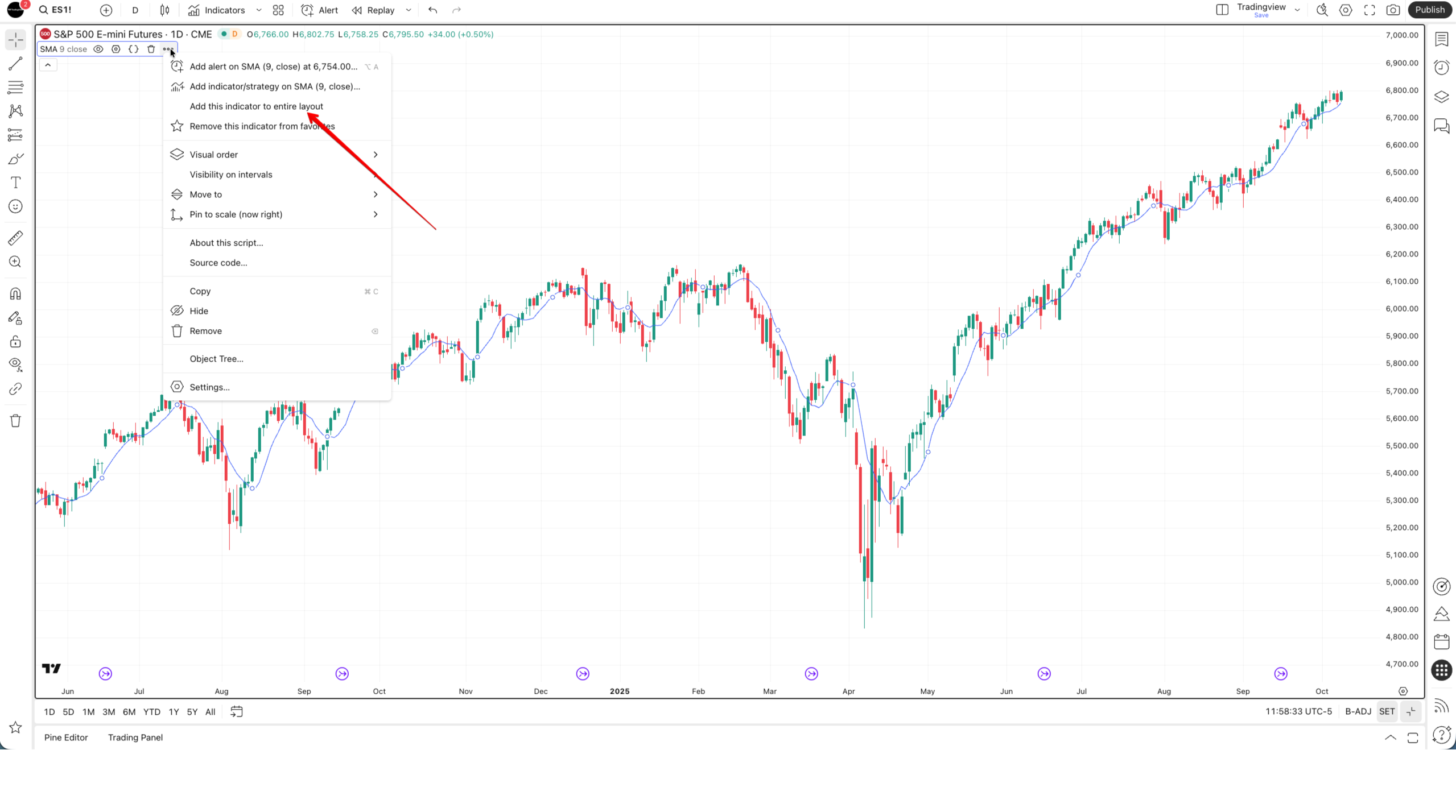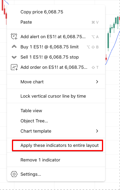 Or, from the chart context menu, you can apply all indicators from the current chart to all others by clicking on Apply these indicators to the entire layout.