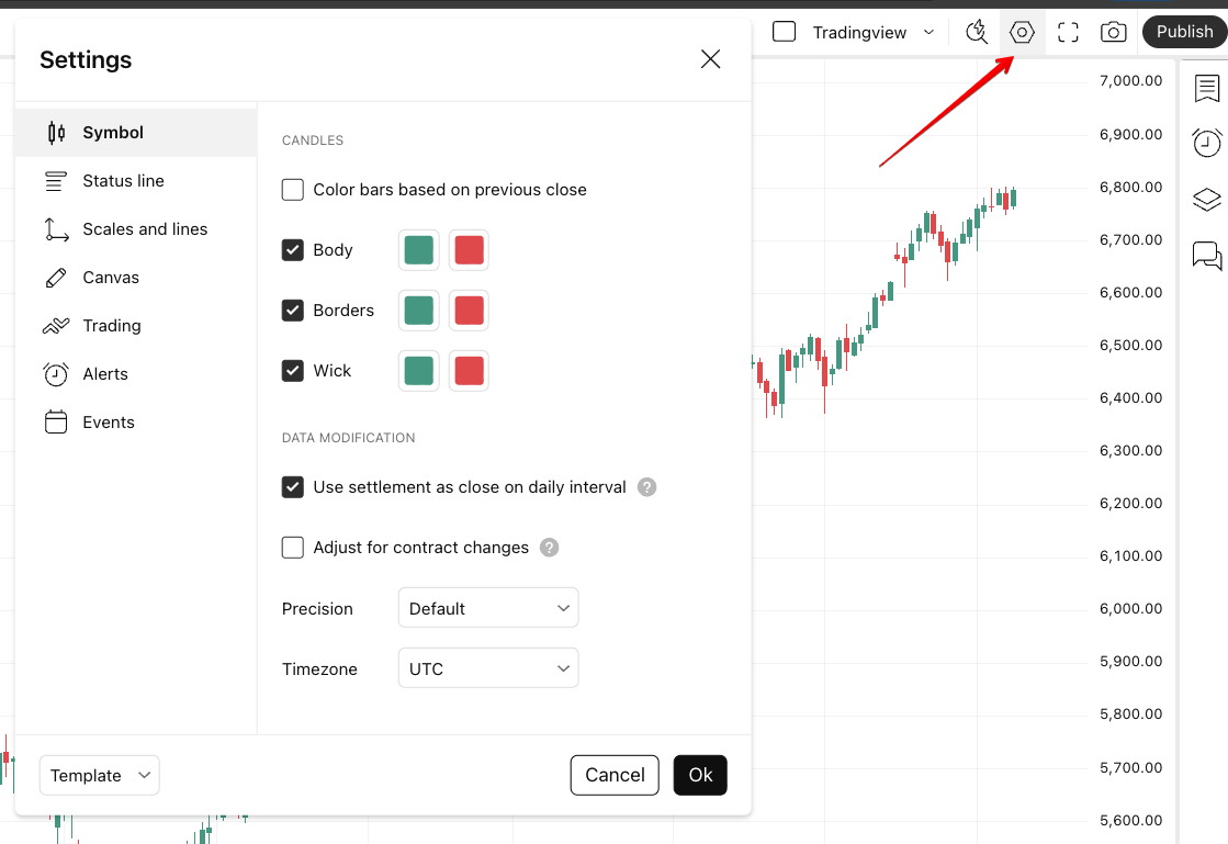 Chart settings: background color, lines, candles, etc