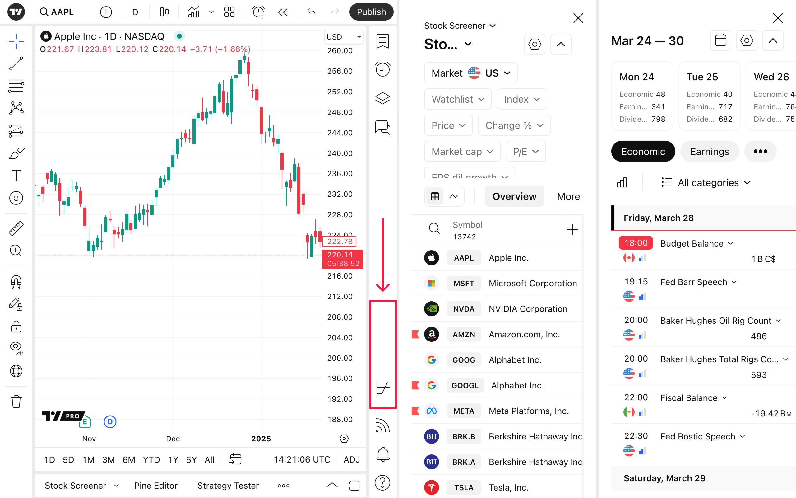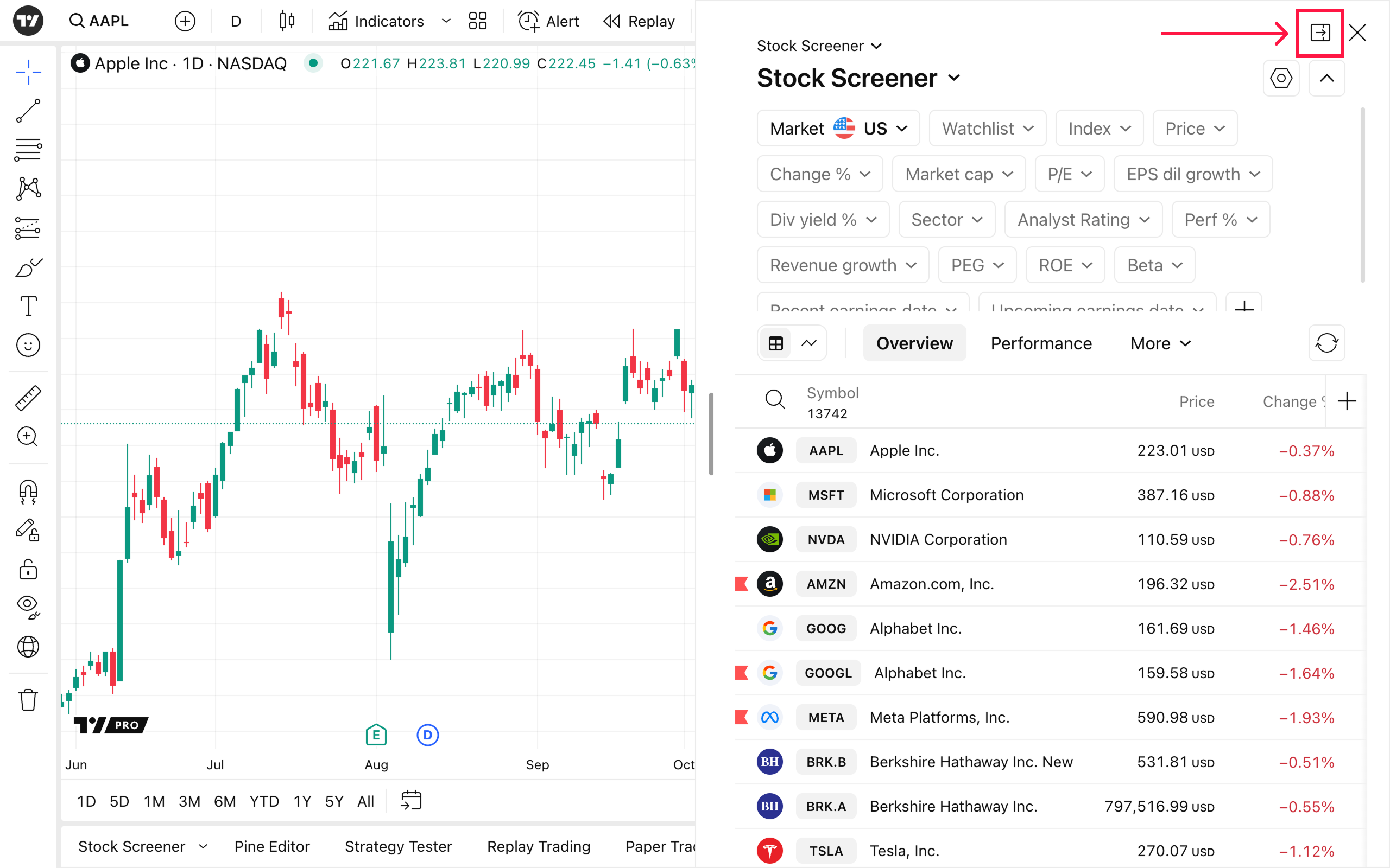 The Split view mode can help you better organize your workspace while charting. It prevents screeners, calendars, options, and other widgets from overlapping your chart, allowing for less noise and greater flexibility.