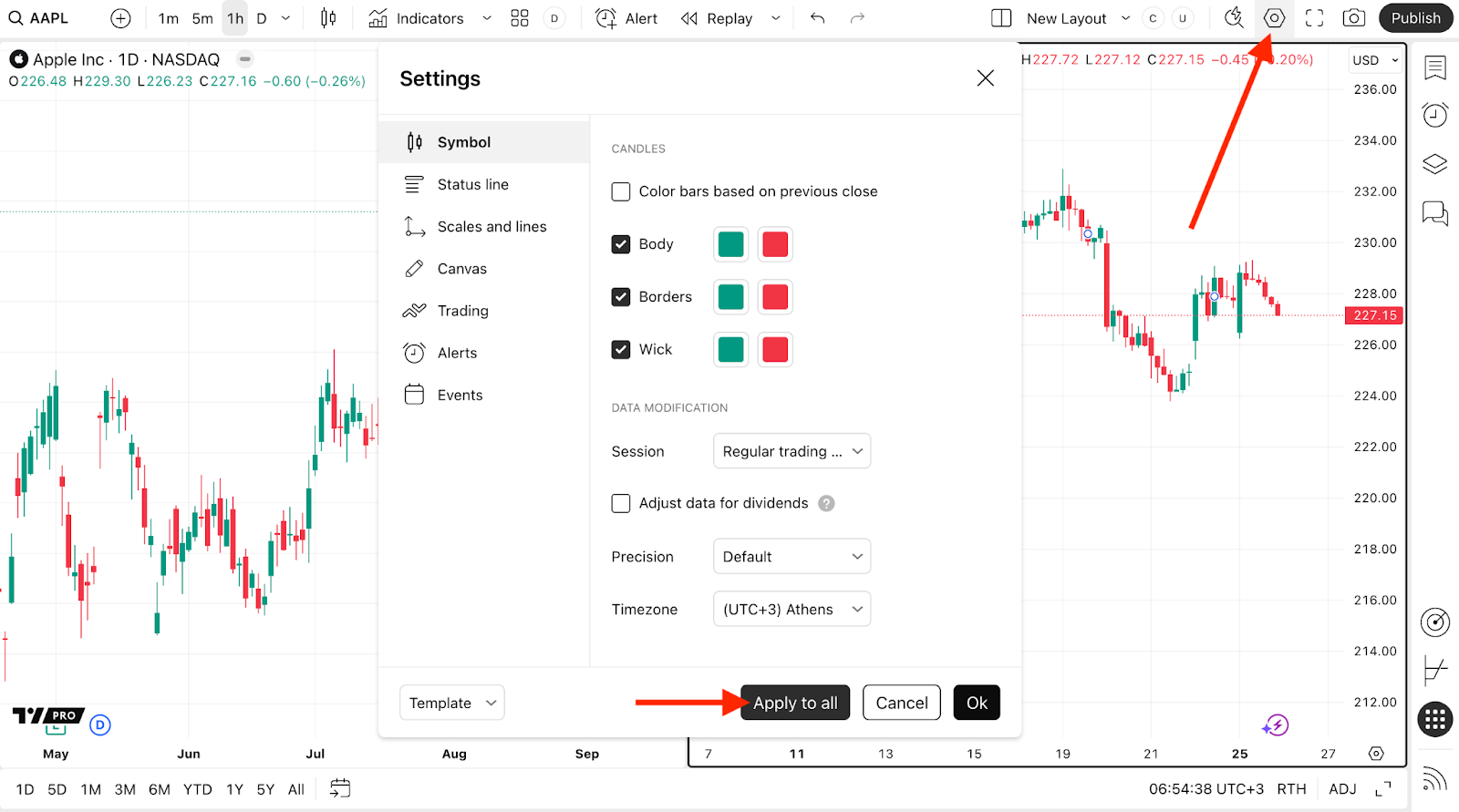 Settings are individual for each chart. However, if you want to apply the settings of a specific chart to all other charts in the layout, just click on the "Apply to all" button located in Settings.