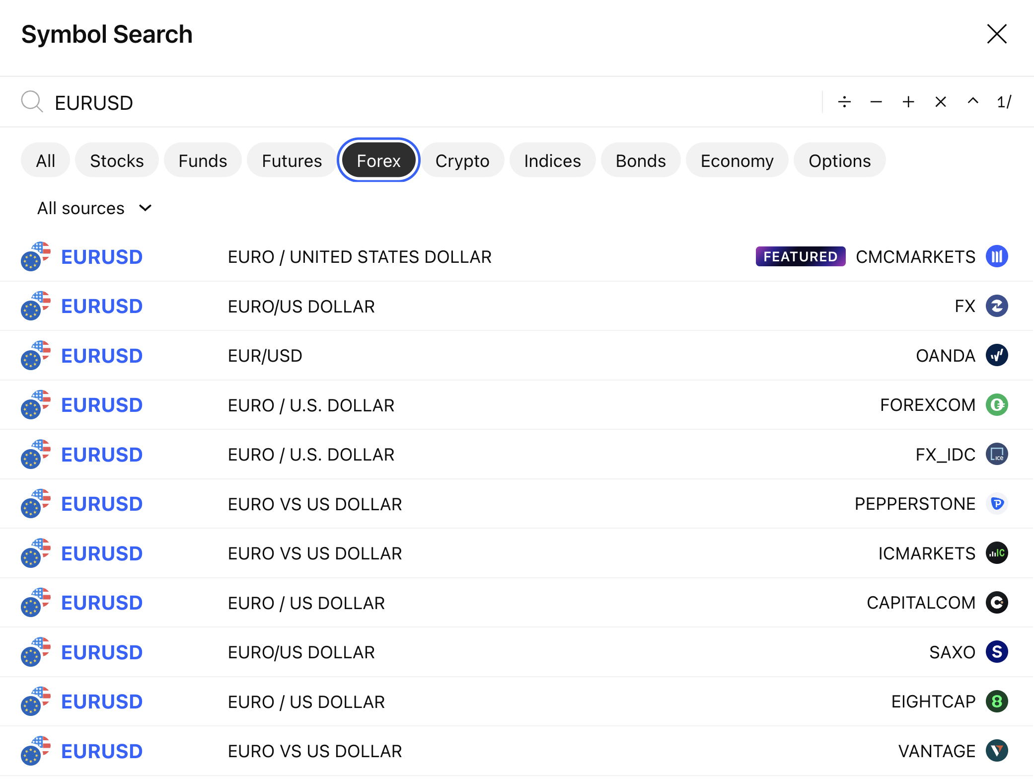 We have different Forex providers, and all can be found under the Forex tab in the Symbol Search.