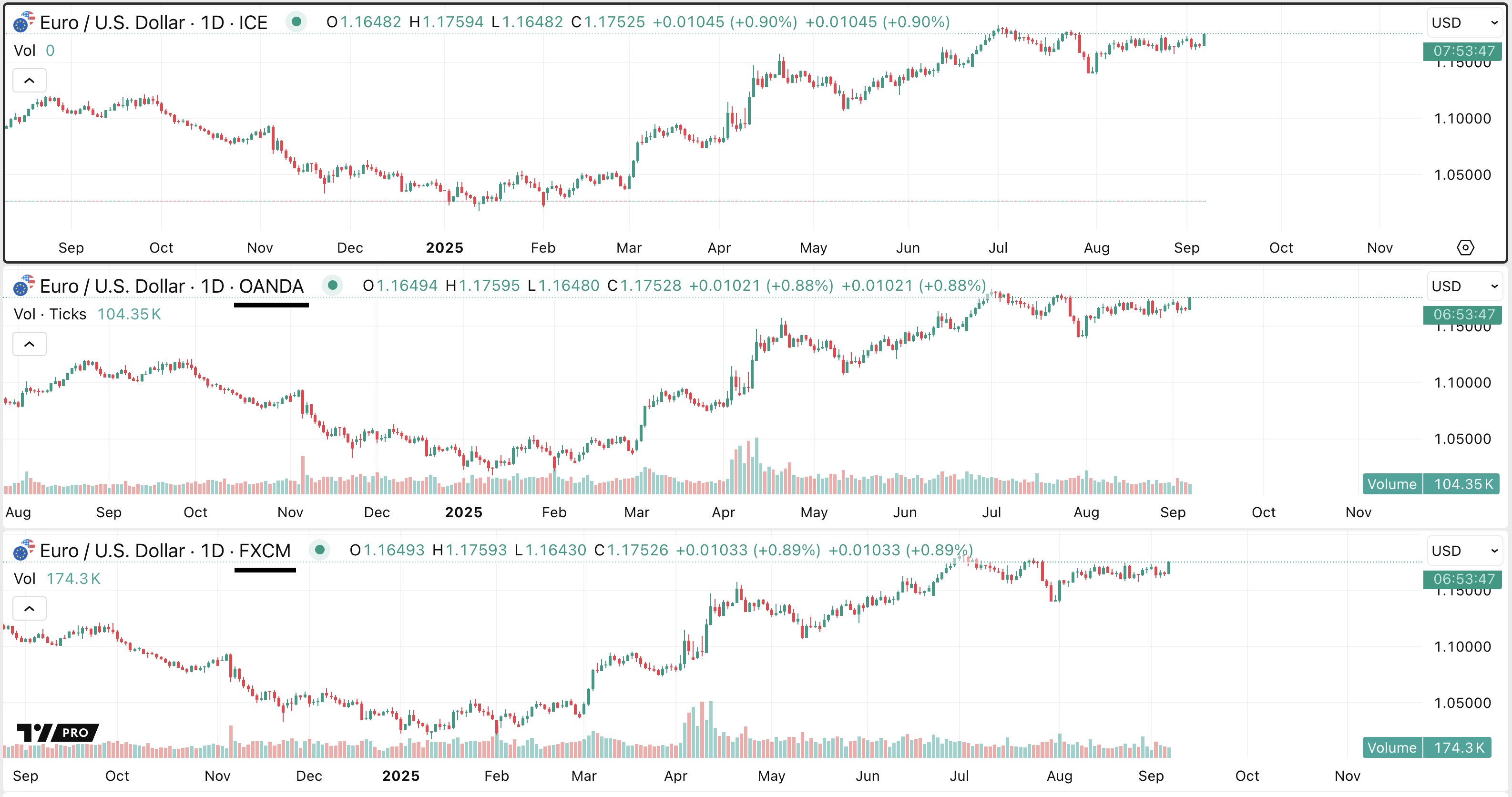Our vendor provides volume only for intraday charts from ICE (timeframes lower than 1 day). Please try using Forex symbols from FXCM or OANDA which have volume for all timeframes.