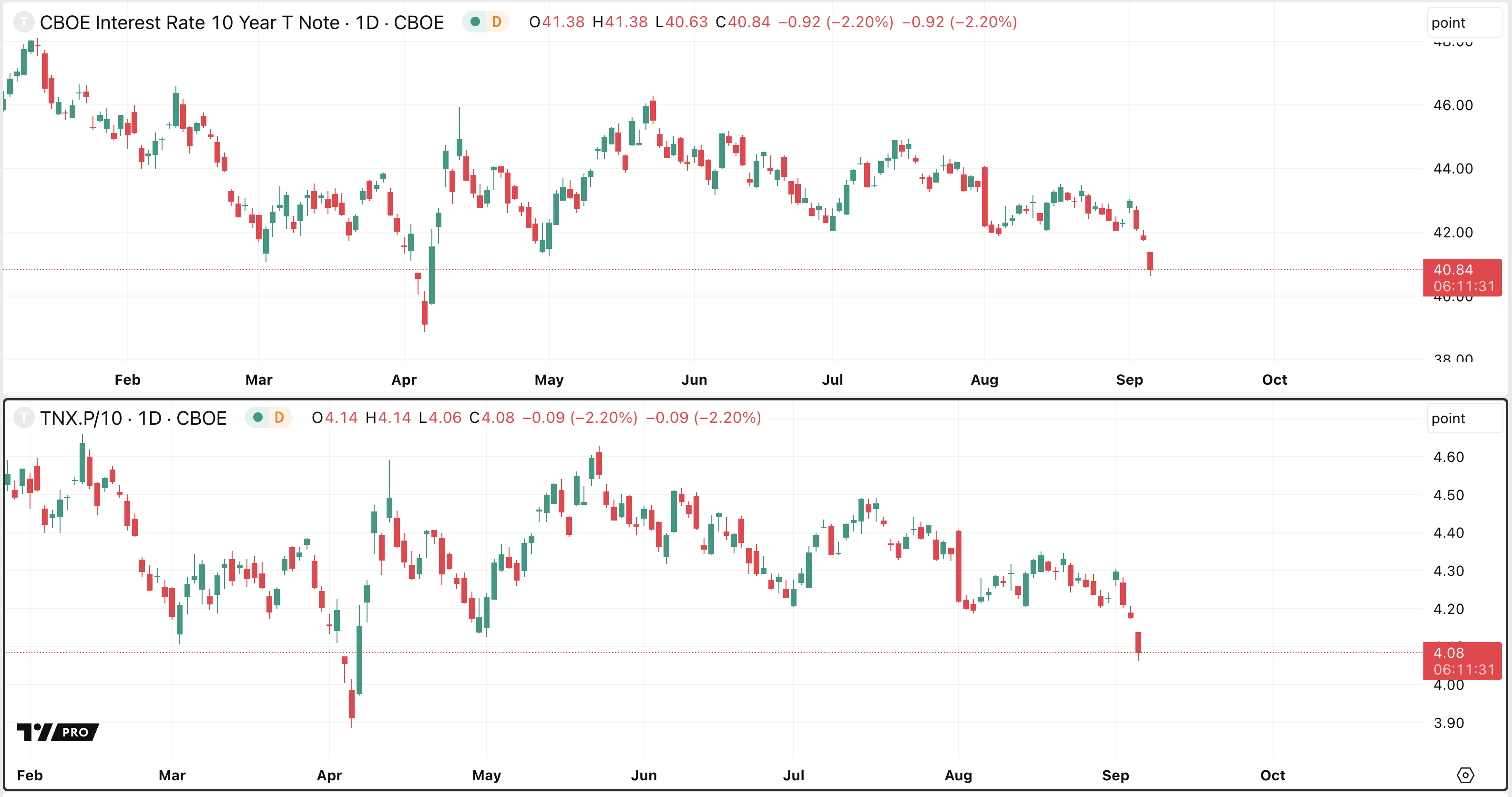 Prices for CBOE:TNX, FVX and TYX are 10 times higher than normal