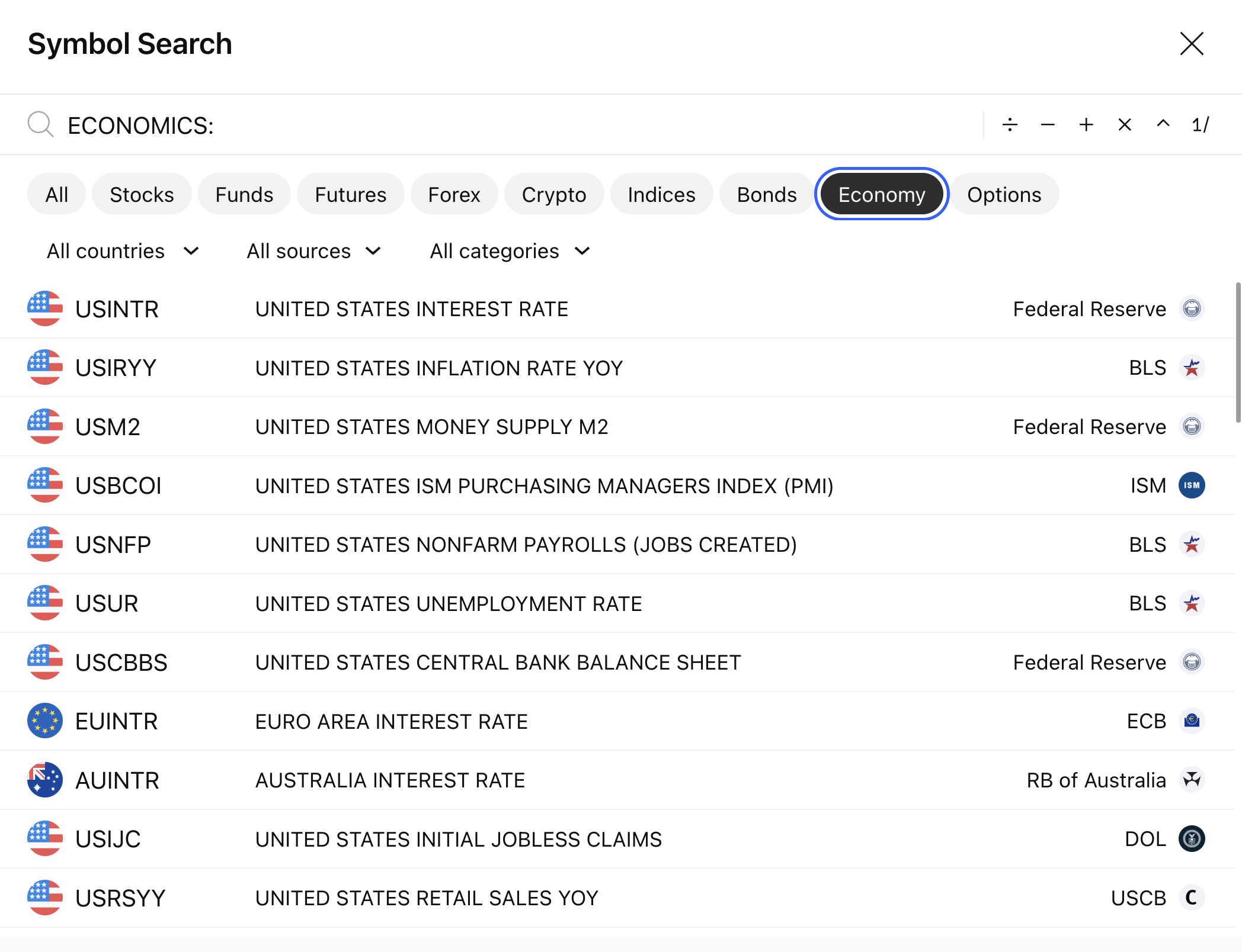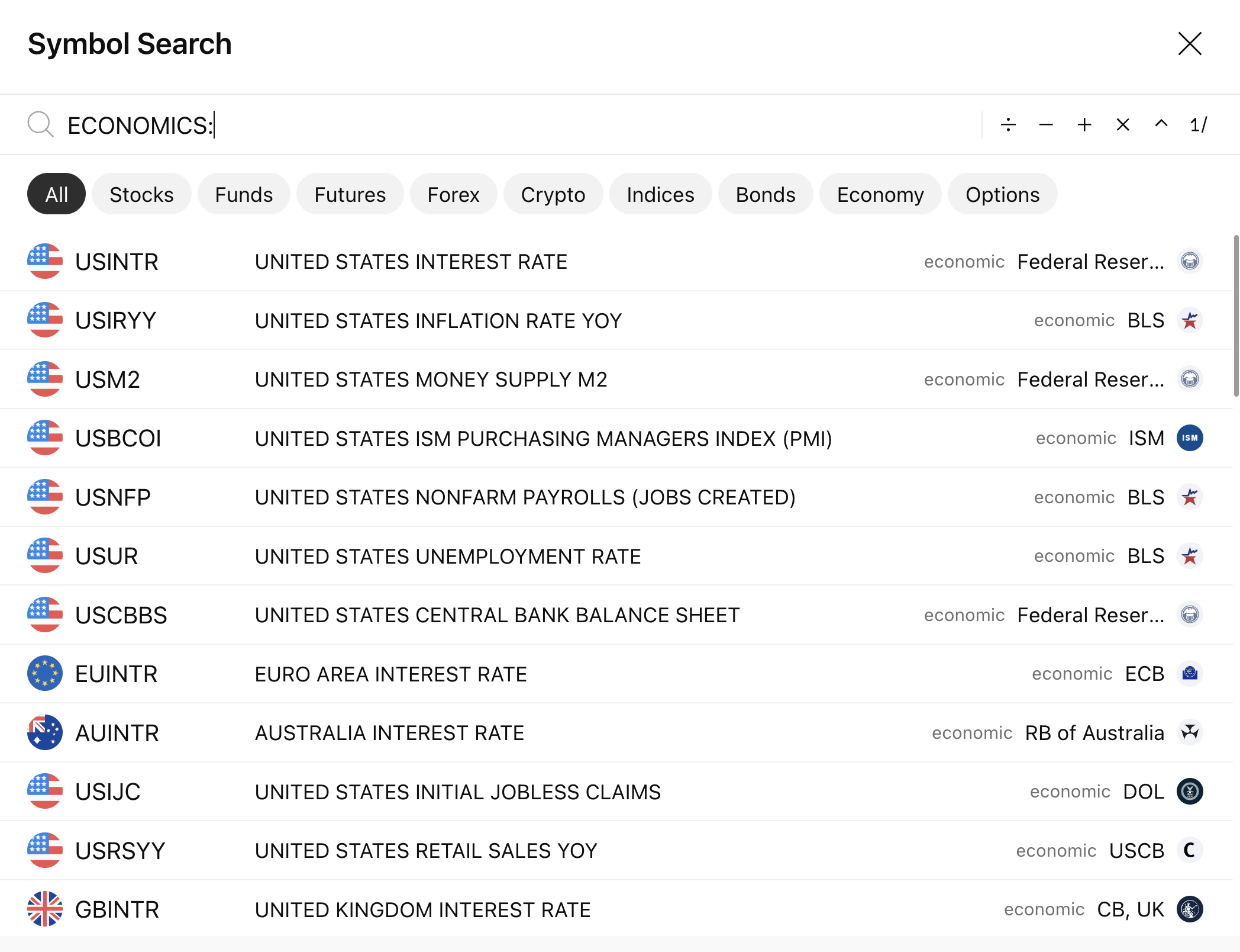 To display economic data on the chart, you need to enter its identifier in the symbol-search. The identifier consists of a two-letter country code (according to ISO 3166-1 alpha-2) followed by the abbreviated name of the indicator.