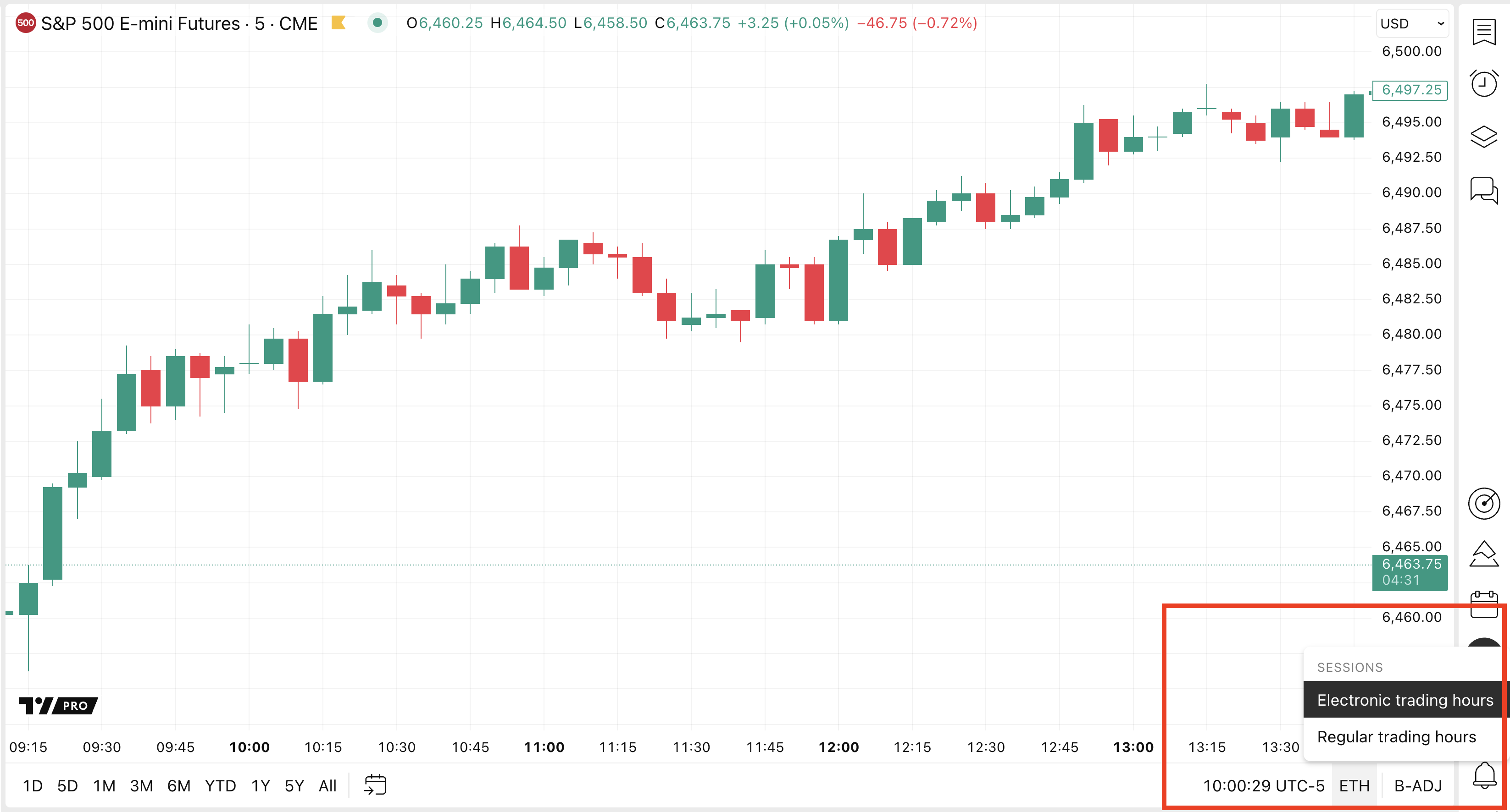 - Regular Trading Hours (RTH) is a reduced session that displays data between 08:30-15:15 CT.