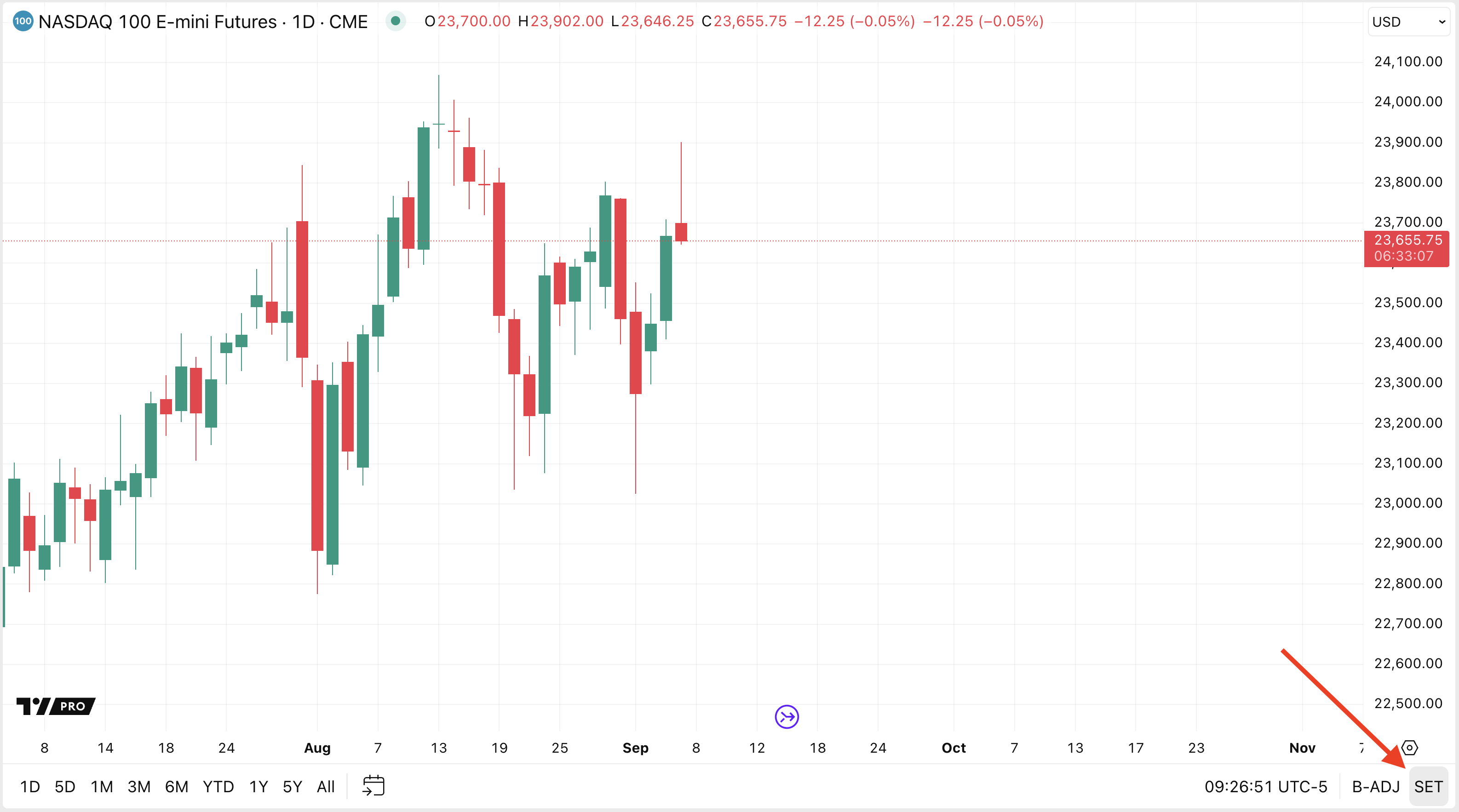 As for intraday timeframes, when switching to intraday from daily, regardless of whether settlement prices were turned on or off, the intraday data is always the same. In this case, there is no set button at the bottom, and there is also no Use settlement as close on daily interval field in the chart settings.