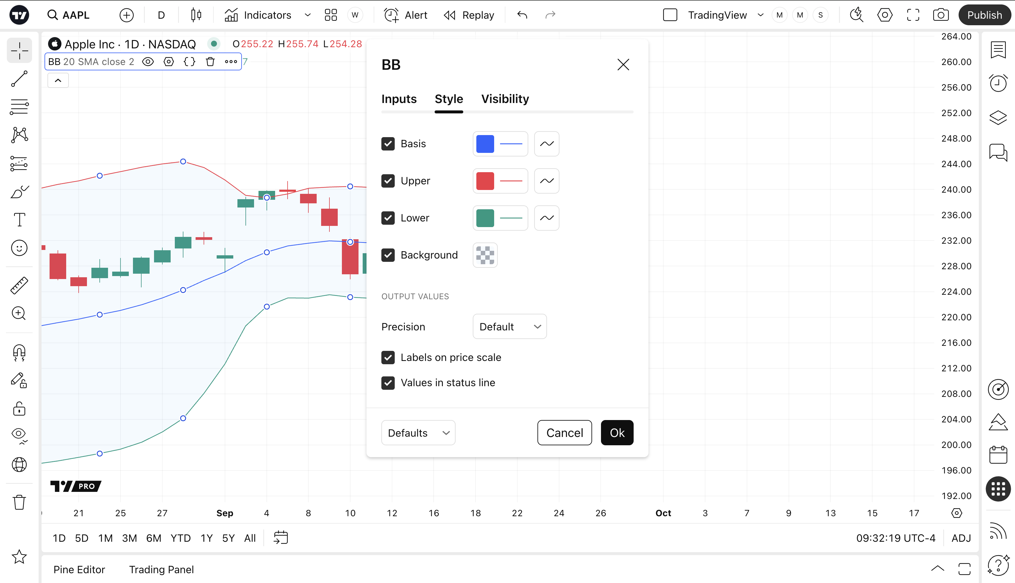Can toggle the visibility of the Lower Band as well as the visibility of a price line showing the actual current price of the Lower Band. Can also select the Lower Band's color, line thickness and line style.