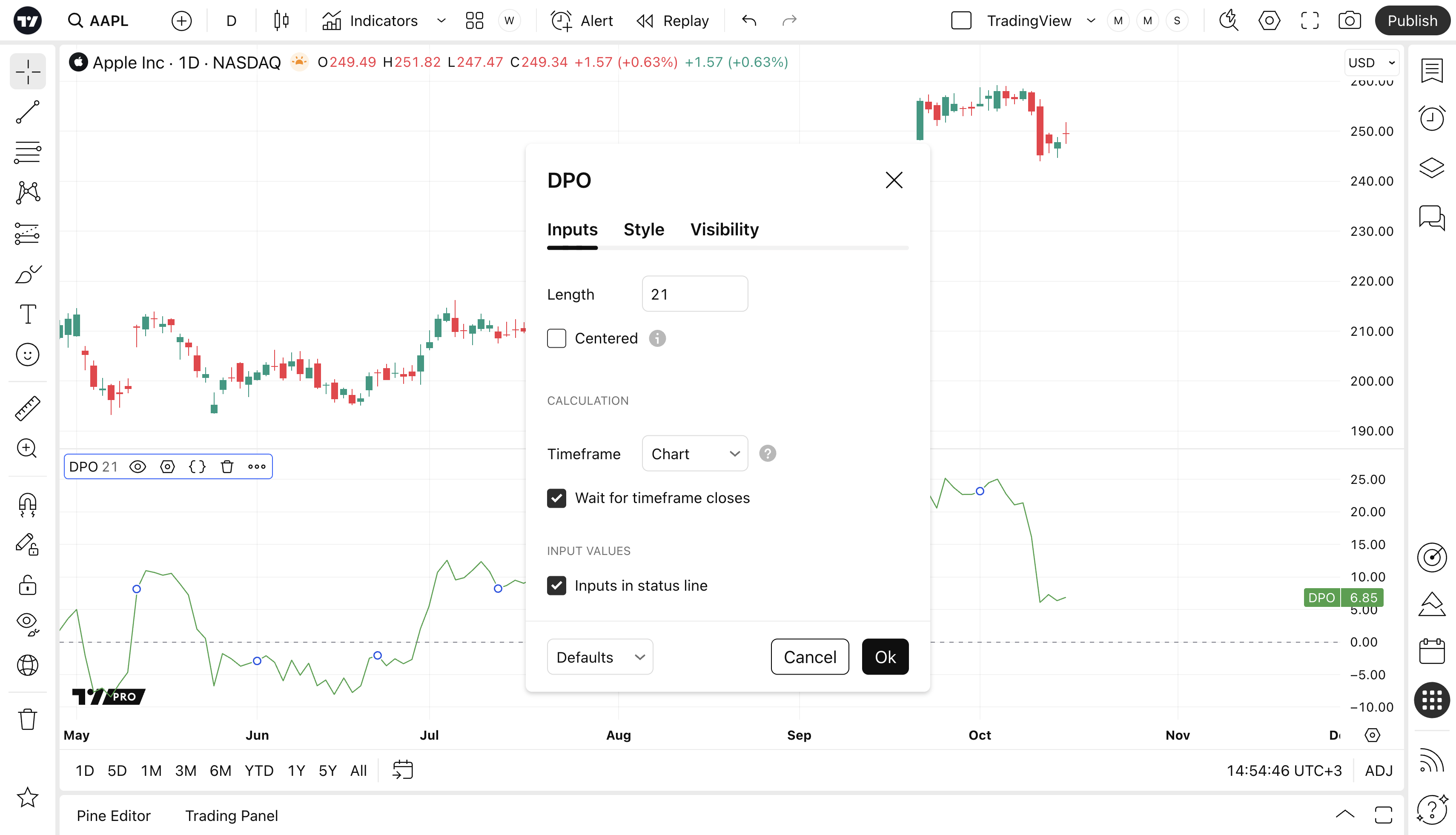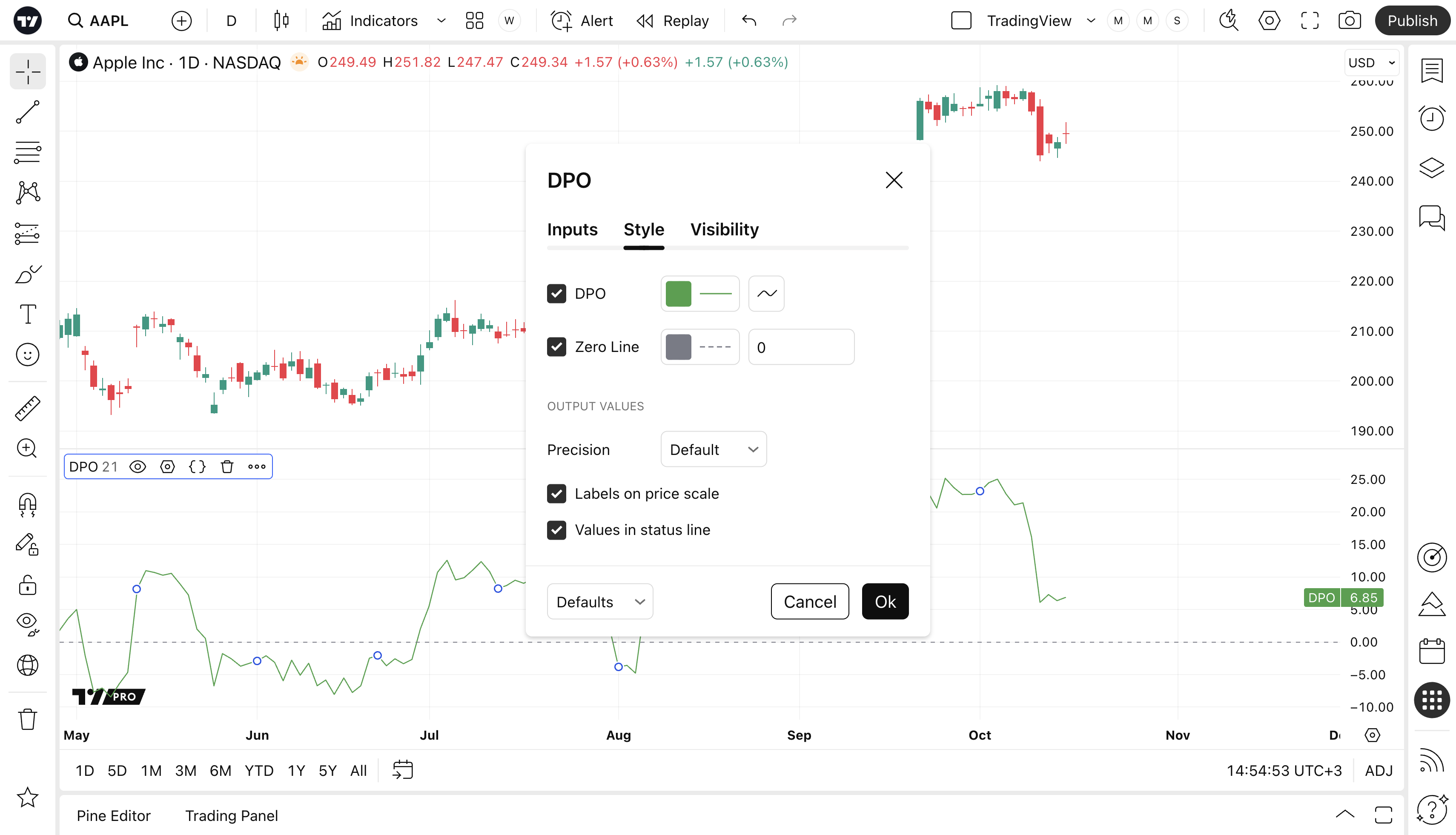 Can toggle the visibility of the DPO as well as the visibility of a price line showing the actual current value of the DPO. Can also select the DPO Line's color, line thickness and visual style (Line is the Default).