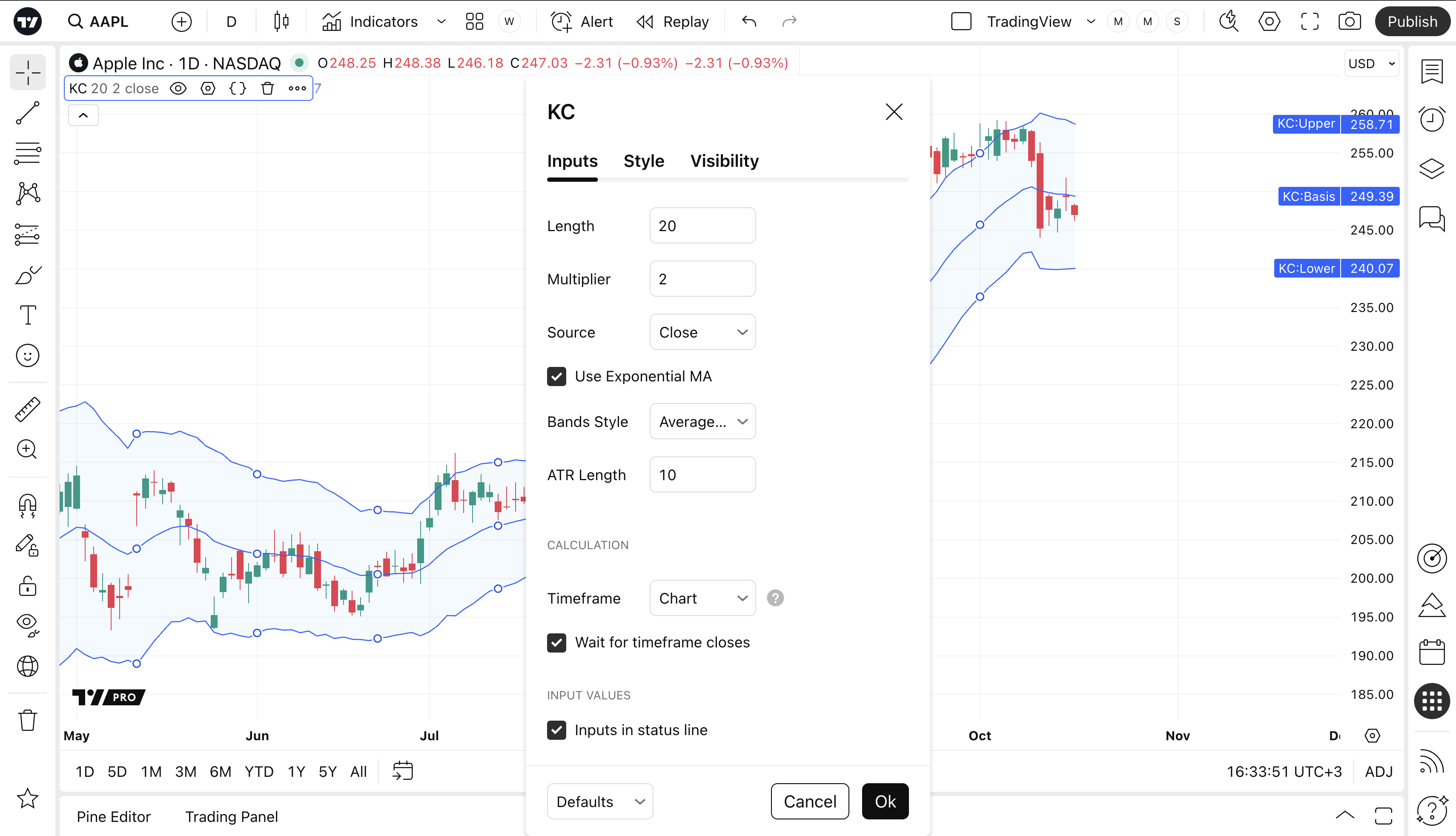 Can toggle the visibility of the Upper Band as well as the visibility of a price line showing the actual current value of the Upper Band. Can also select the Upper Band's color, line thickness and line style.