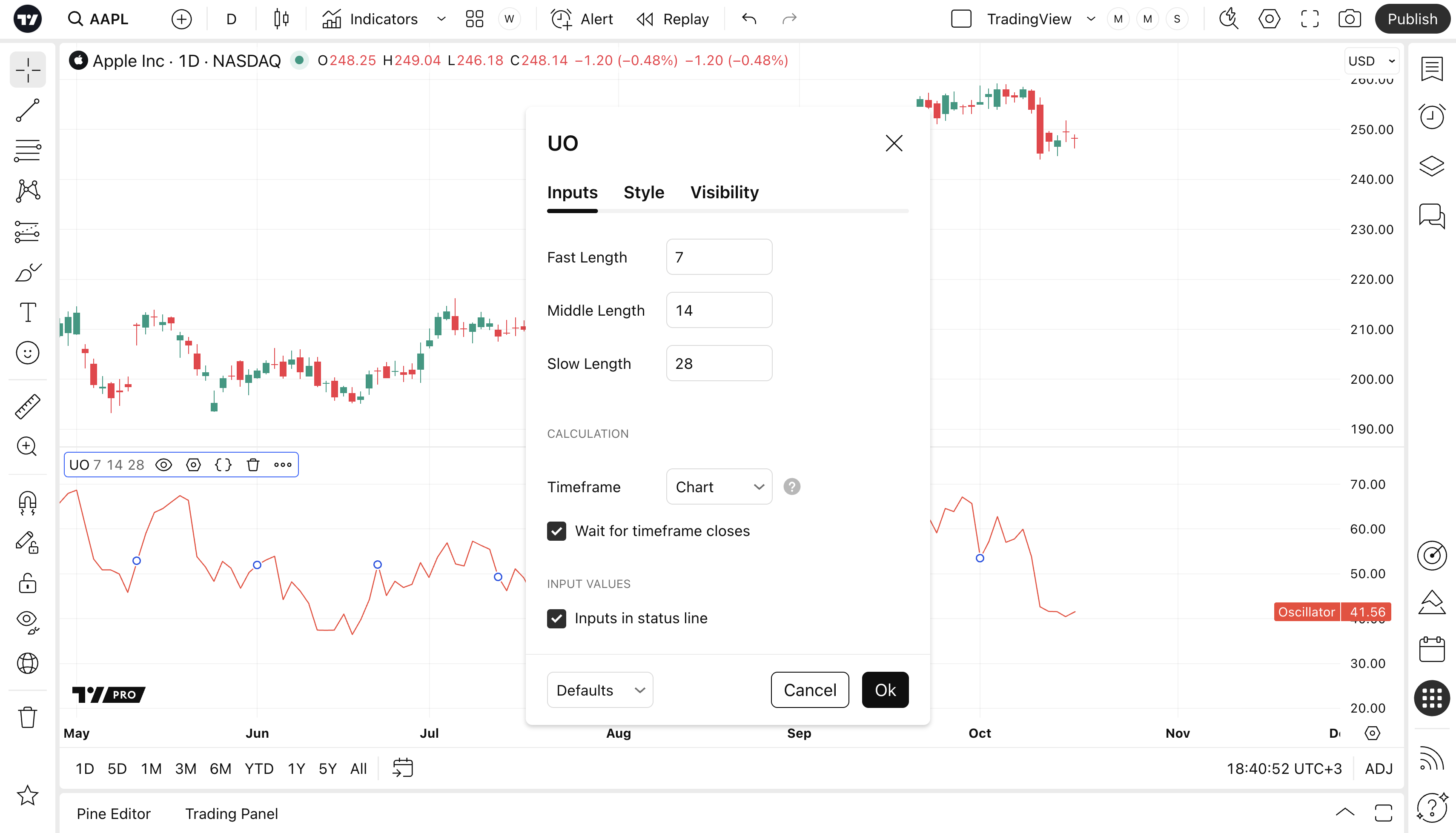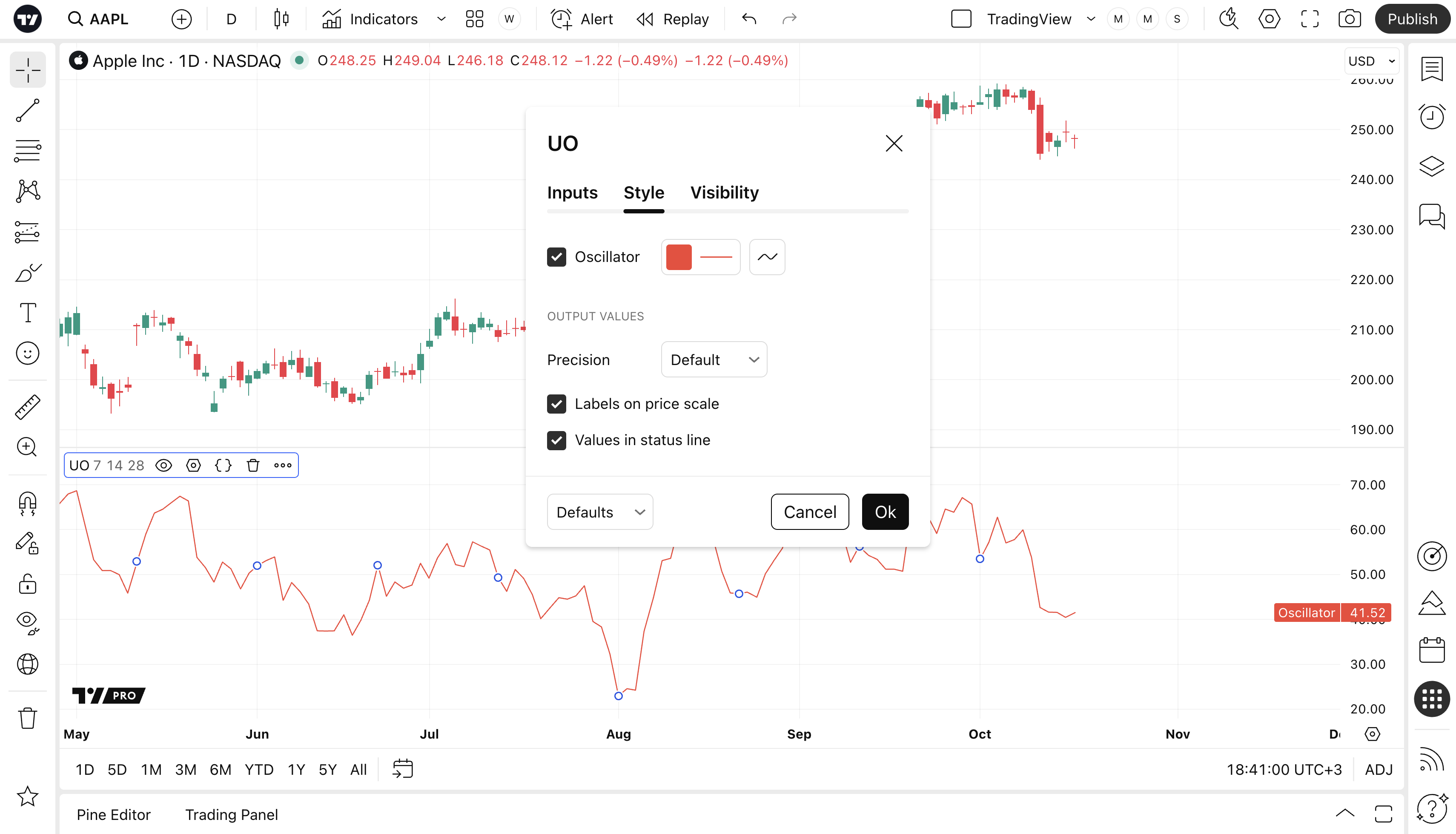 Can toggle the visibility of the UO as well as the visibility of a price line showing the actual current value of the UO. Can also select the UO Line's color, line thickness and visual style style.