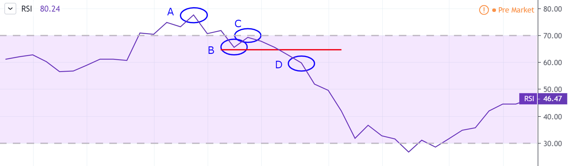 - RSI drops lower than its previous low.