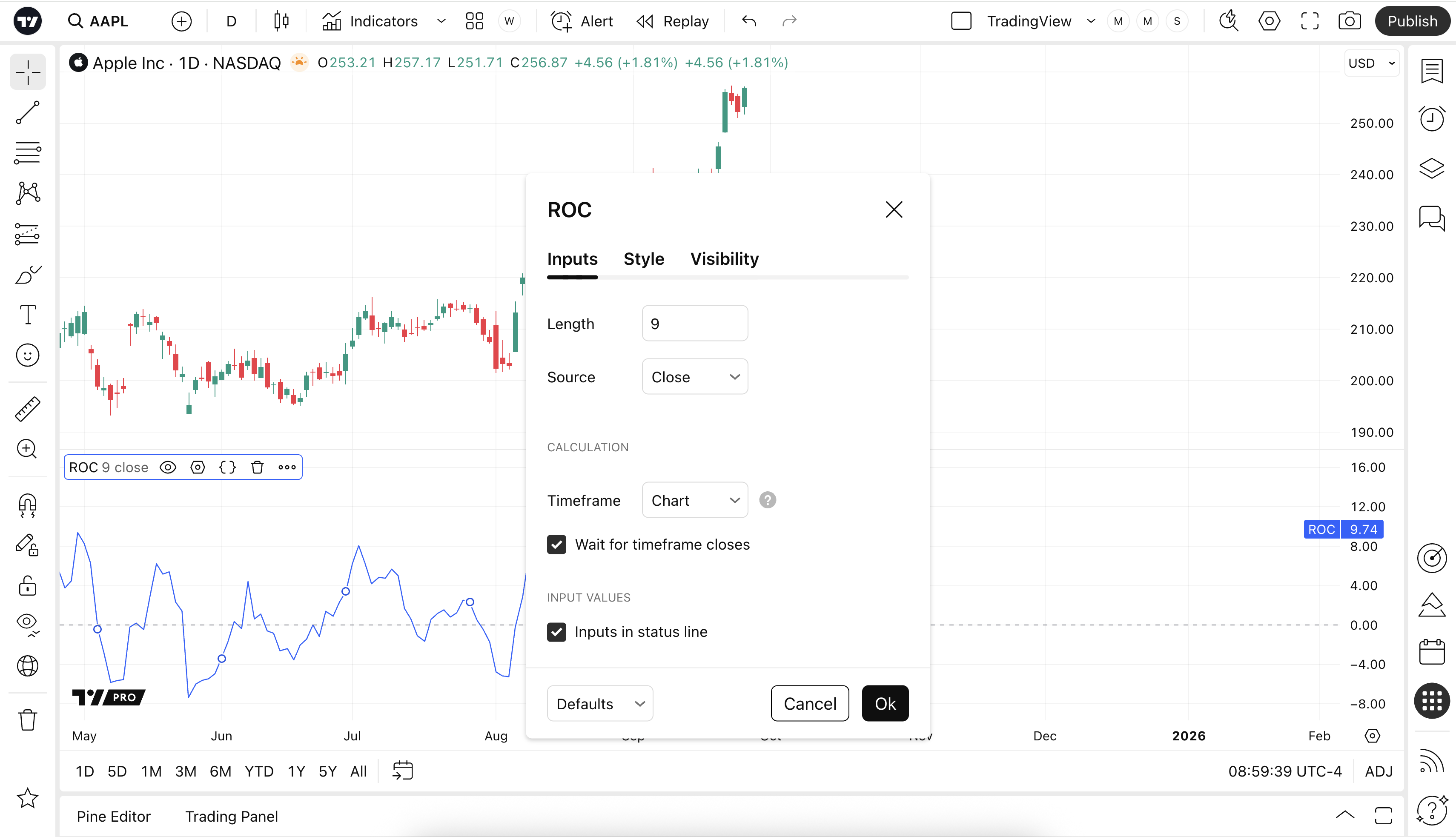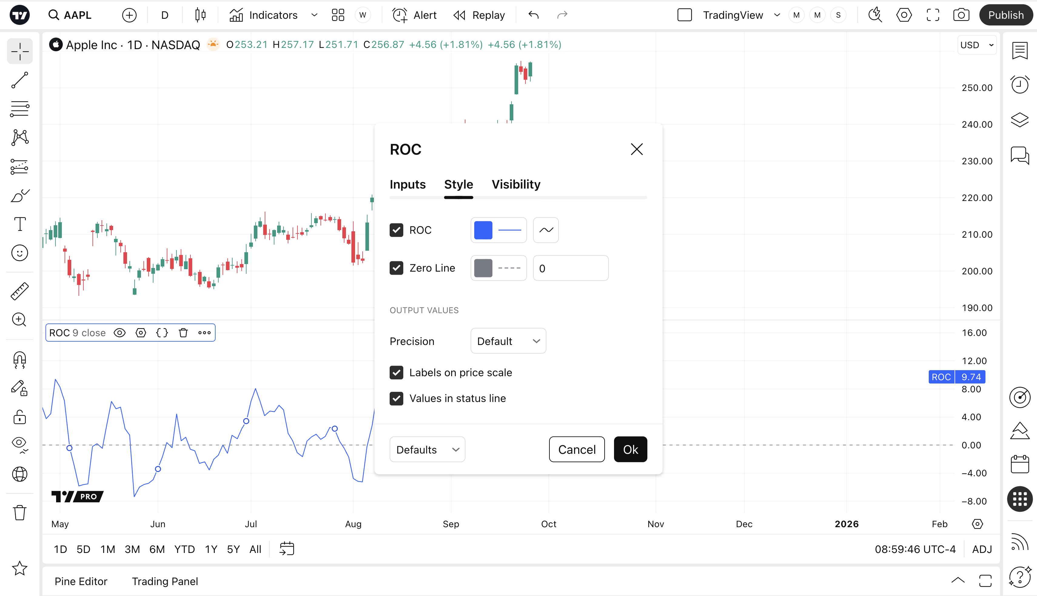 Can toggle the visibility of the ROC as well as the visibility of a price line showing the actual current price of the ROC. Can also select the ROC Line's color, line thickness and visual style.