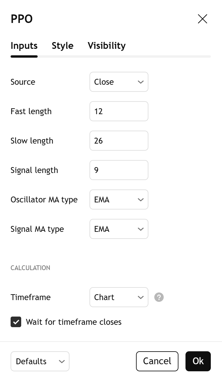 PPO = (Fast MA − Slow MA) / Slow MA × 100Signal = Moving average of PPOHistogram = PPO − SignalWhere: