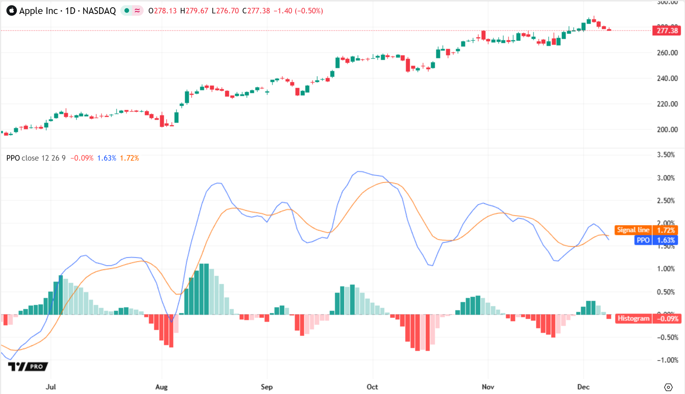 The Percentage Price Oscillator (PPO) is a momentum indicator that measures the relative difference between two moving averages. Similar to the MACD indicator, the PPO consists of three components: the main oscillator, a smoothed signal line, and a histogram line that represents the difference between those values.