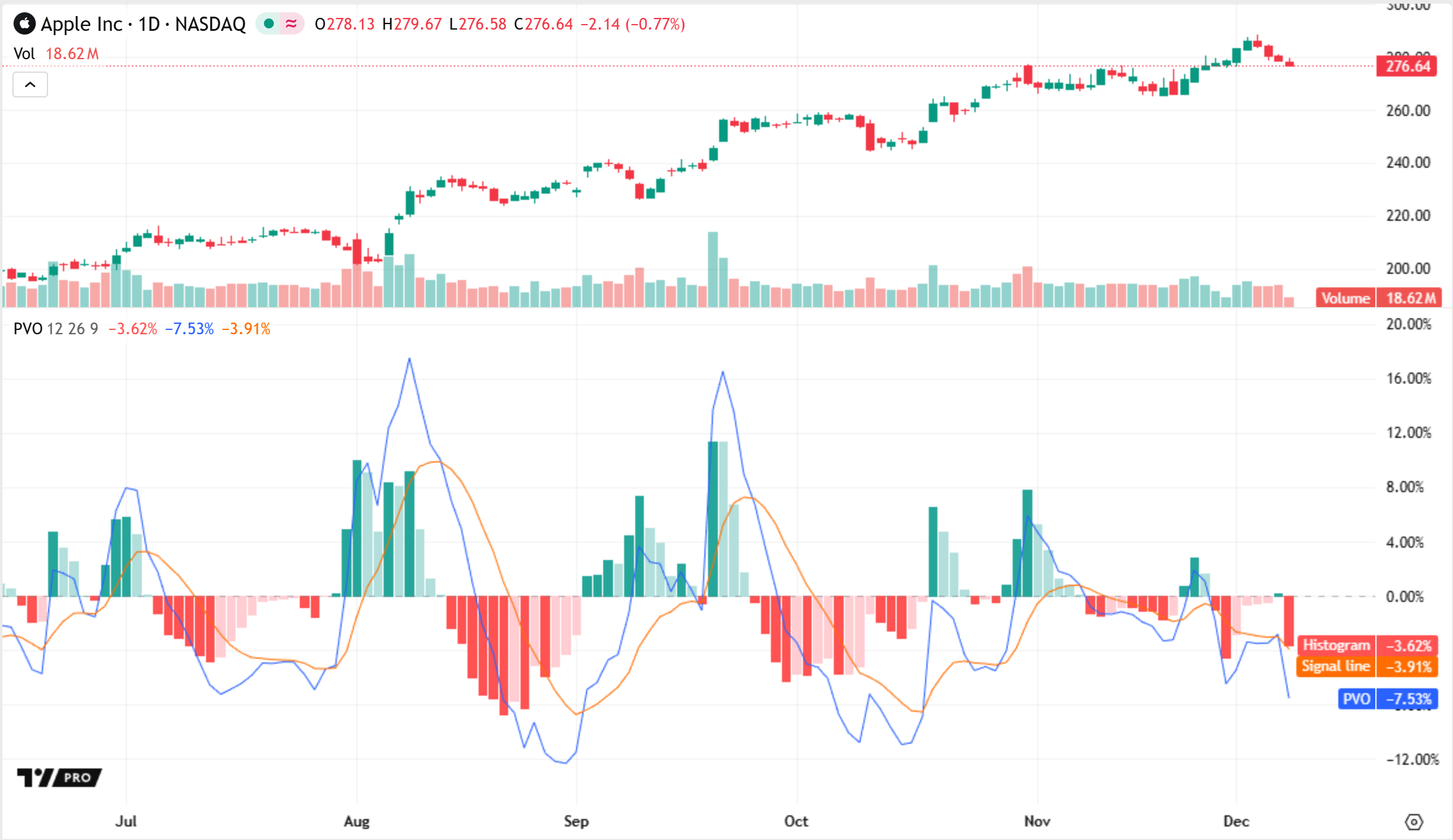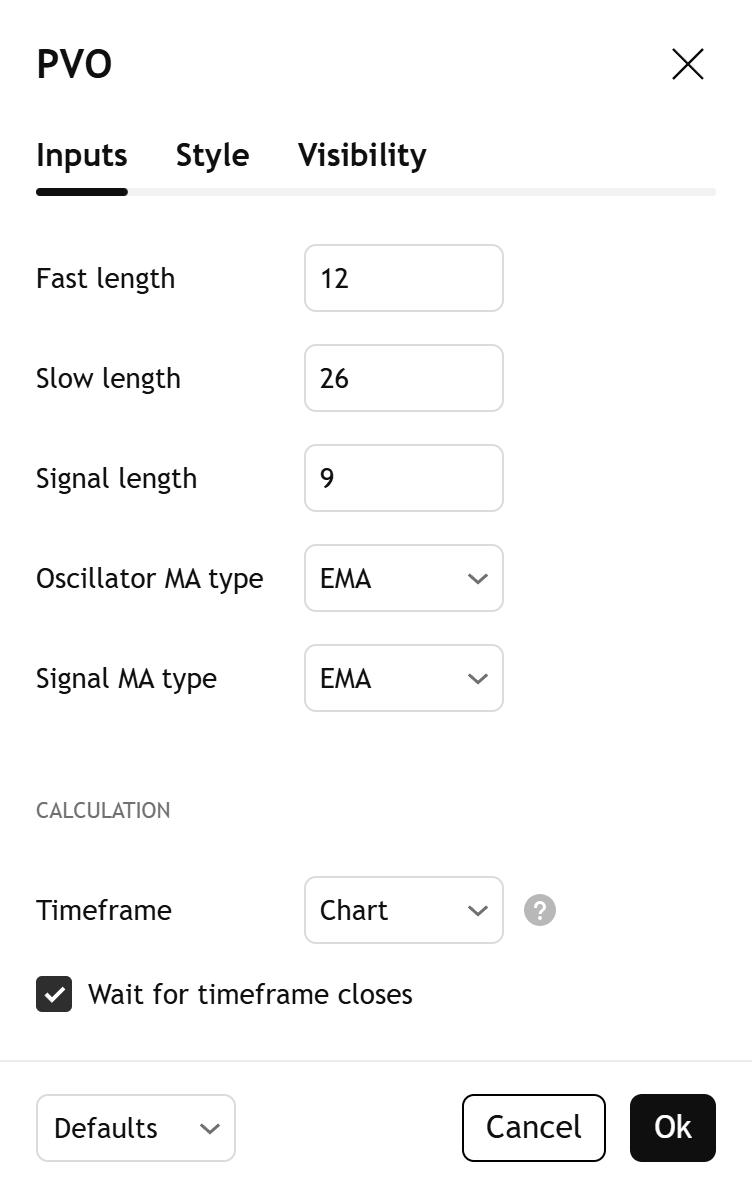 PVO = (Fast Volume MA − Slow Volume MA) / Slow Volume MA × 100Signal = Moving average of PVOHistogram = PVO − SignalWhere: