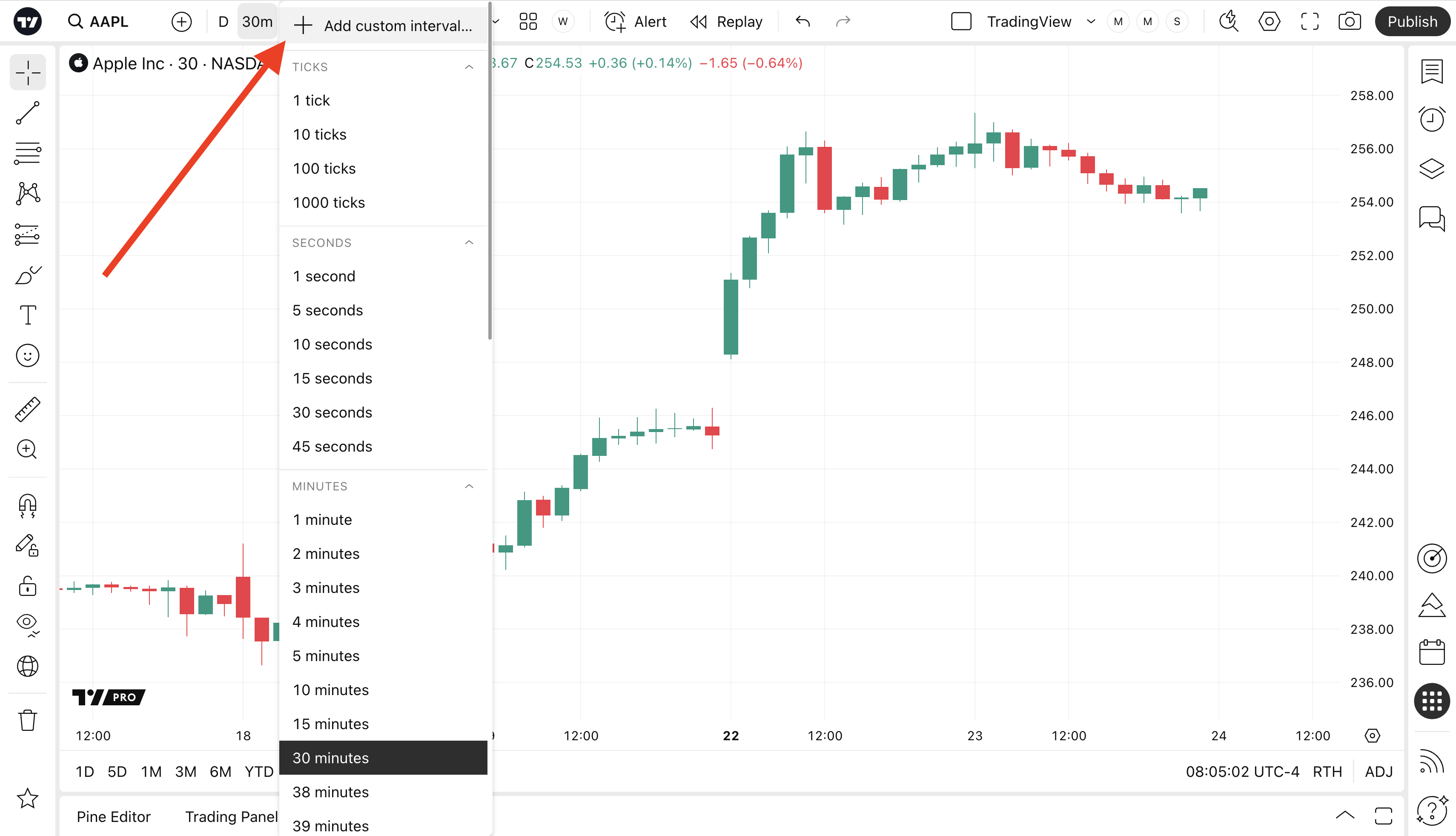 If you want to add new timeframes to the "Timeframe" dropdown, you can do this by adding them to the main "Time Interval" dropdown menu available on the chart page. The list of custom timeframes is shared between the two menus.