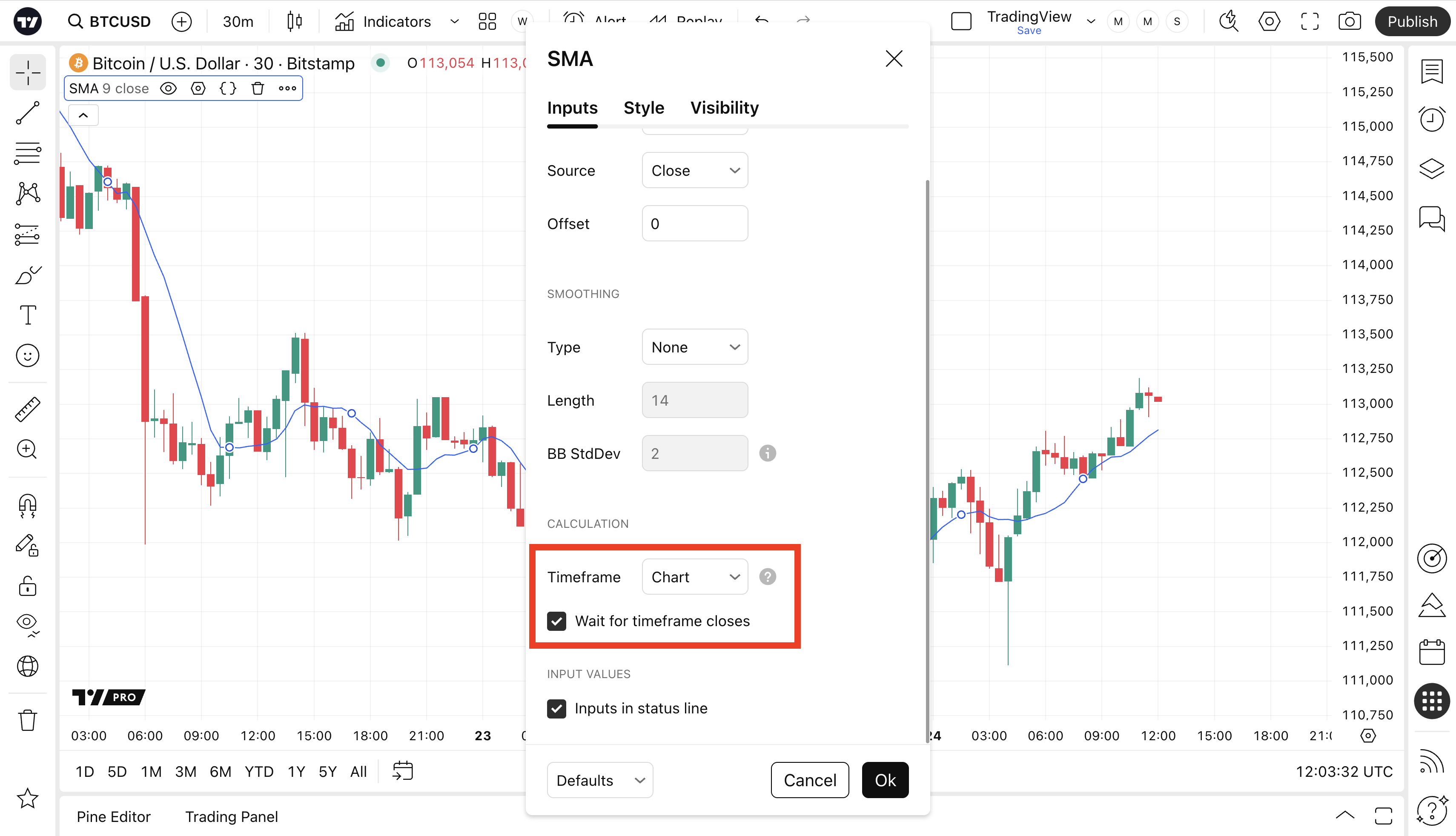 If 'Wait for timeframe closes' is unchecked, historical gaps are filled with the last returned value. On real-time bars, the last available value will be returned on every tick, allowing you to track the real-time development of the indicator's values. With this setting enabled, the indicator will produce non-repainting values on historical bars, but repainting values in real time.
