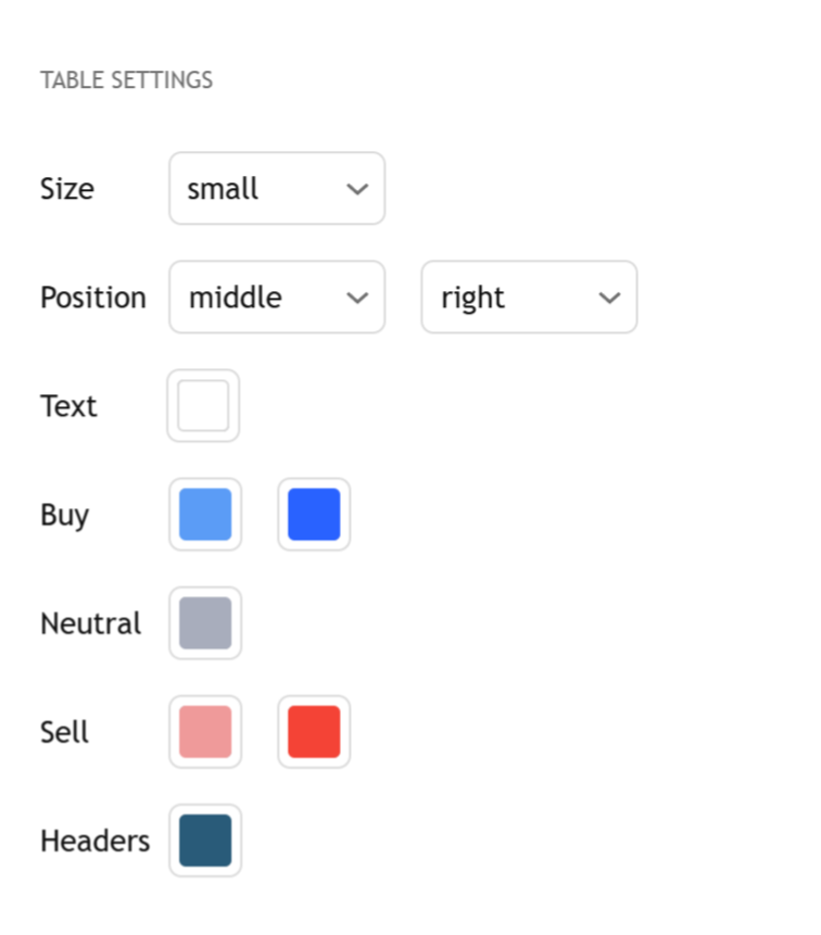 - Color inputs: Set the table's text and header colors, and the background colors for each rating category. The Buy, Neutral, and Sell color inputs also set the colors of the plotted columns.