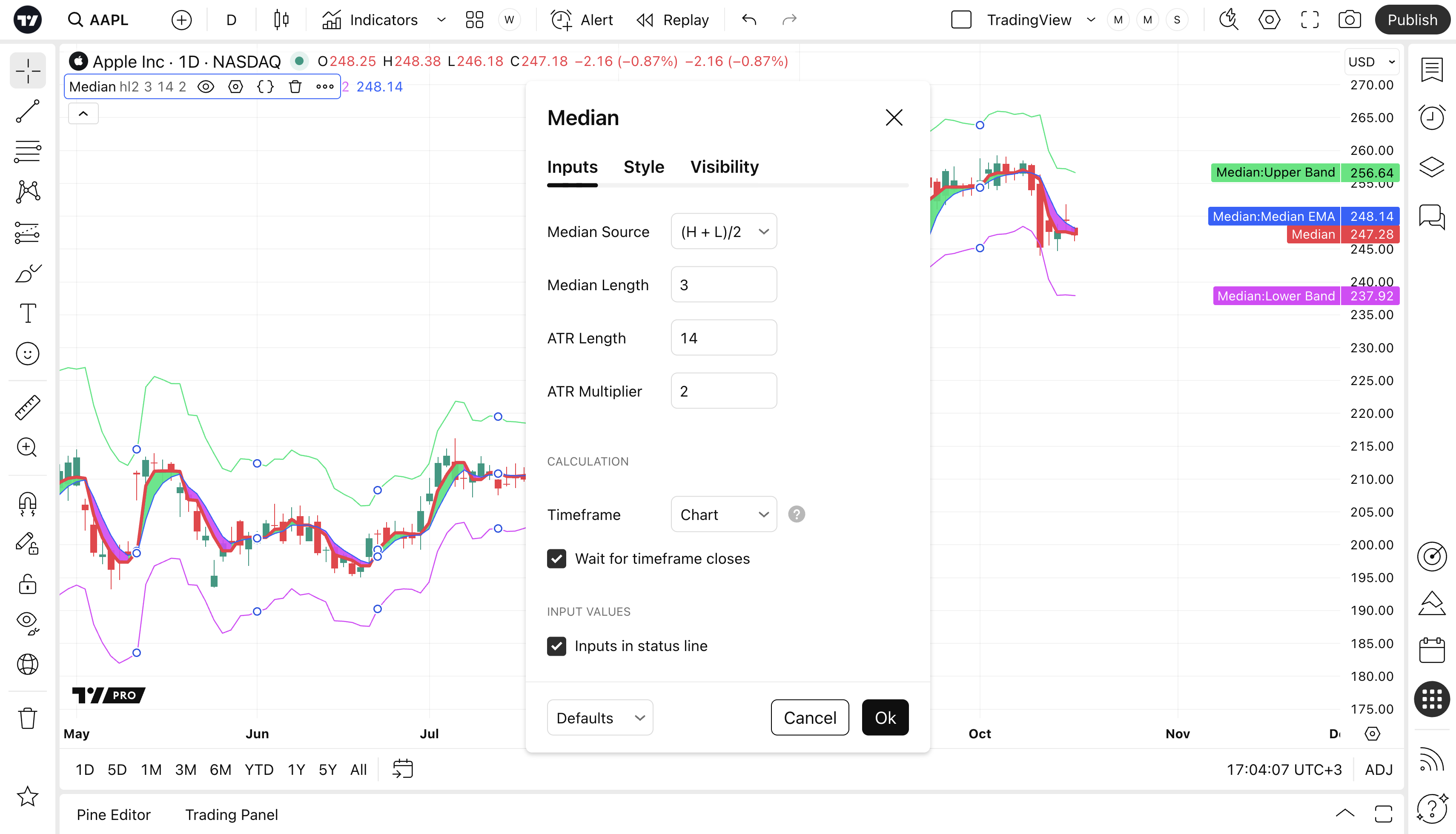 The Median indicator is a tool that can be used to measure the market direction and volatility. It forms a channel based on how ATR deviates from the middle of the range. The indicator displays the median value of the average between high and low for the specified length. That median is compared to its EMA for the same length: the space between the median and its EMA is presented as a cloud colored according to which of the values is higher. The green cloud appears when the median is higher and indicates an uptrend, while the violet cloud signifies a downtrend.