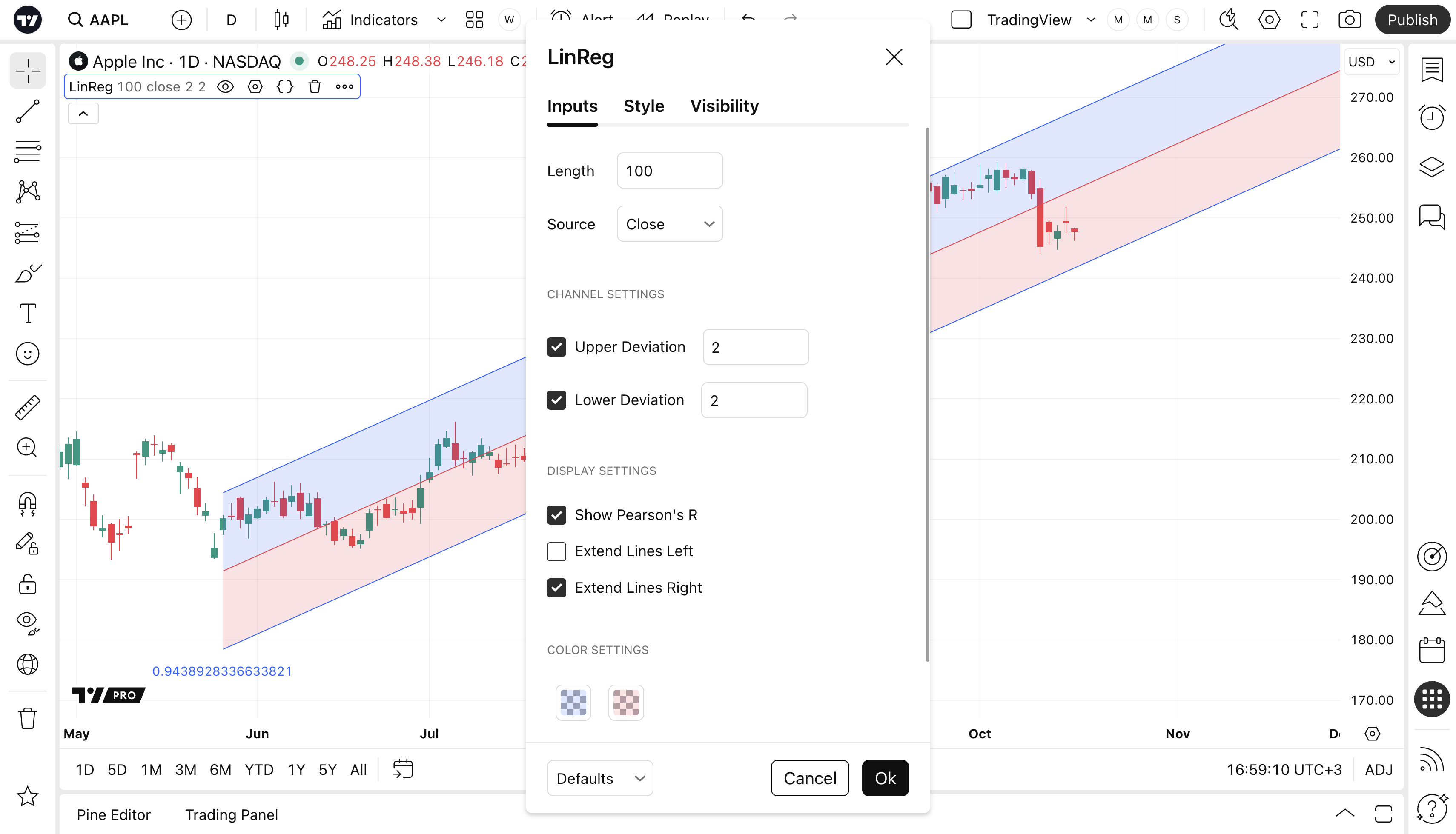 The Linear Regression indicator visualizes the general price trend of a specific part of the chart based on the Linear Regression calculation. The central line of the indicator is the linear regression calculation itself, and the lines above or below it are X number of standard deviations removed from the main one. This is a good tool to use to determine when a price is unusually far away from its baseline.