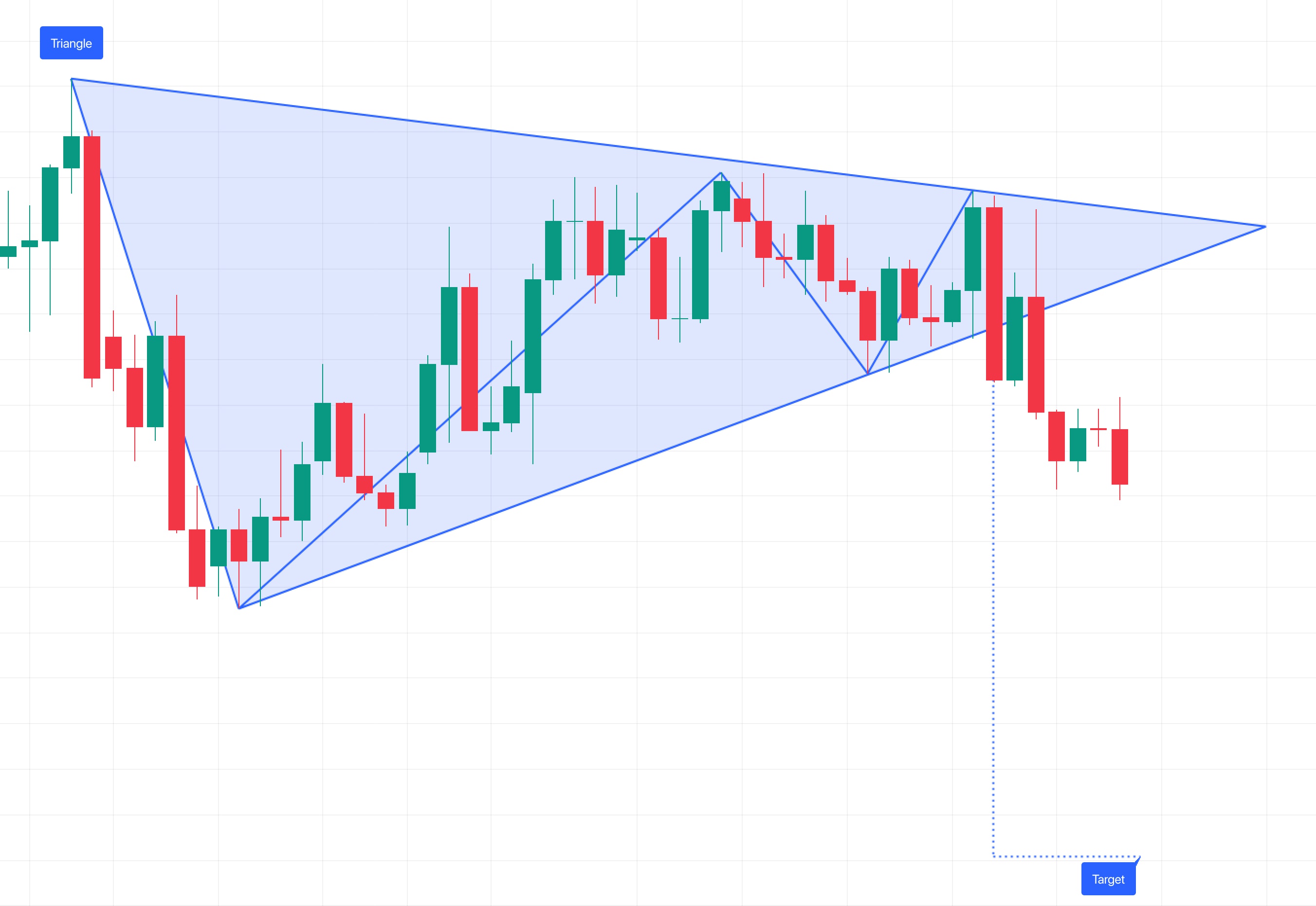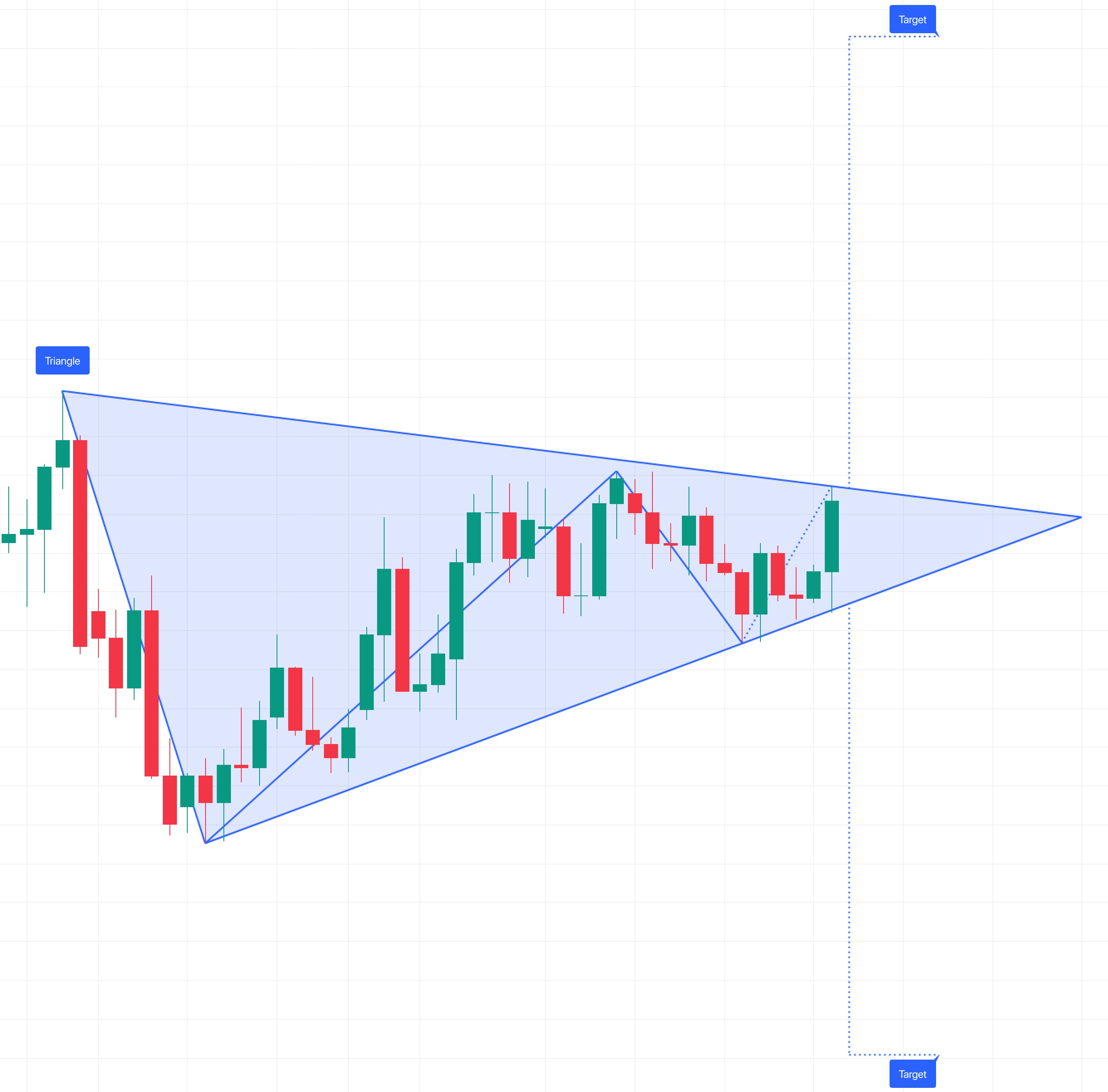 A triangle is an indefinite pattern that can herald both an increase and a fall in price. The target price level depends on the direction in which the price broke this pattern. It is expected that after the pattern breakout, the price will go approximately to the height of the triangle base in the direction of the breakout.