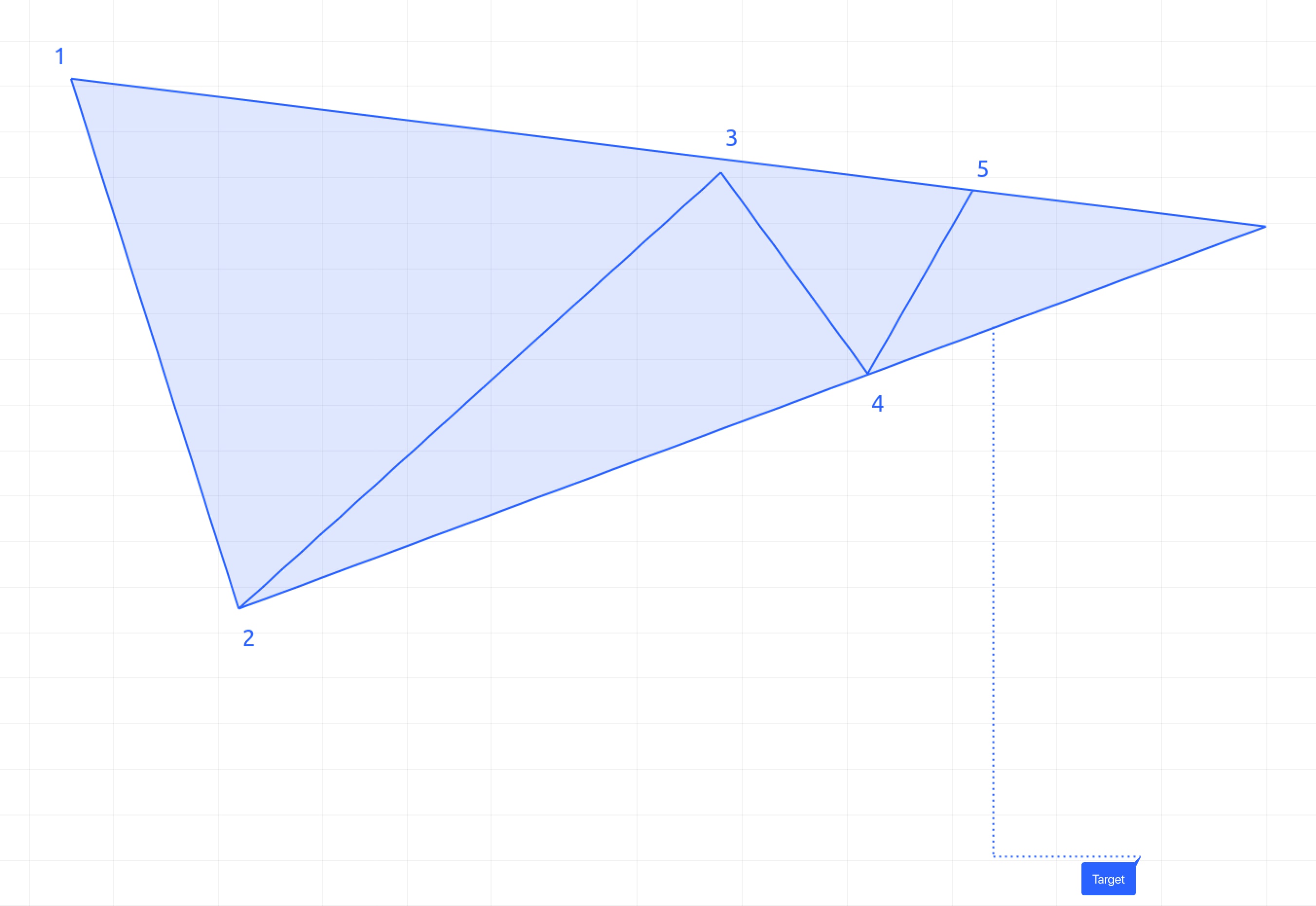 The indicator searches for patterns on the last 600 bars. The pattern consists of lines denoting price movements (Price Line) and lines forming a triangle (Triangle). The start and end points of each price line are in 5/5 pivots. A pivot point is a local extremum (minimum or maximum) to the left and right of which there are no price values that exceed this extremum. Thus, a point will be a 5/5 pivot high if there are no high values 5 bars to the left and 5 bars to the right of it that are higher than this value at this point. The breakout of the pattern is fixed by the close value. The intersection of the lines of the triangle with the close value in the interval between points 1 and 5 is not allowed. In the In Progress mode, the indicator looks for not only formed, but also emerging patterns. The last two points of such a pattern may not be in pivots, and the last price line will be dotted.