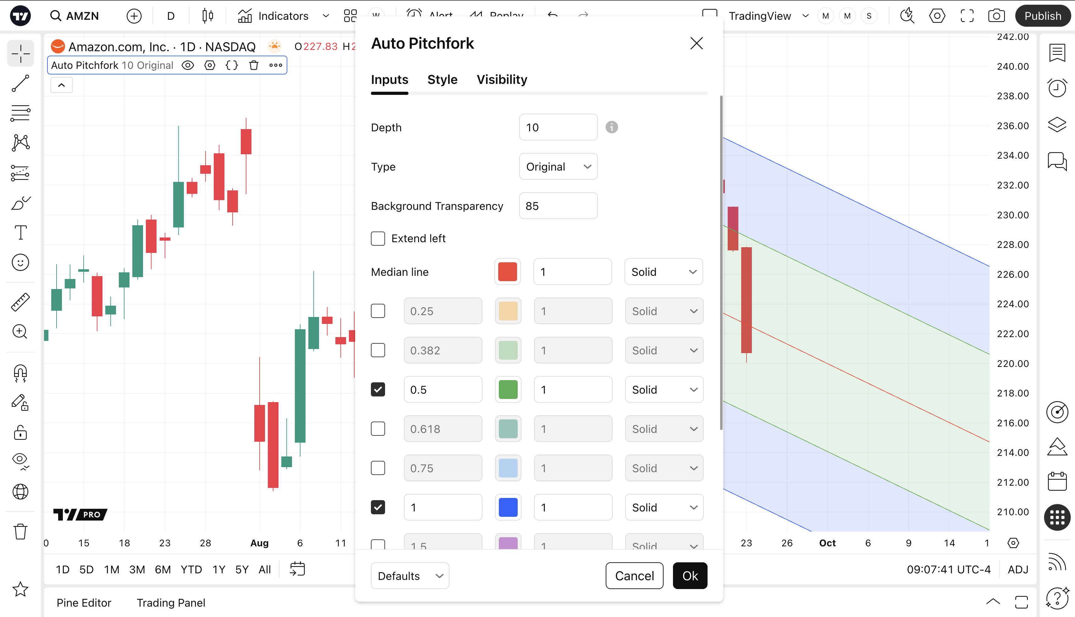 Level settings allow you to tweak each level of the pitchfork separately. You can change the visibility (turn on/off), Fibonacci ratio used to calculate the line, color that the line and its background use, width of the line, and its type.
