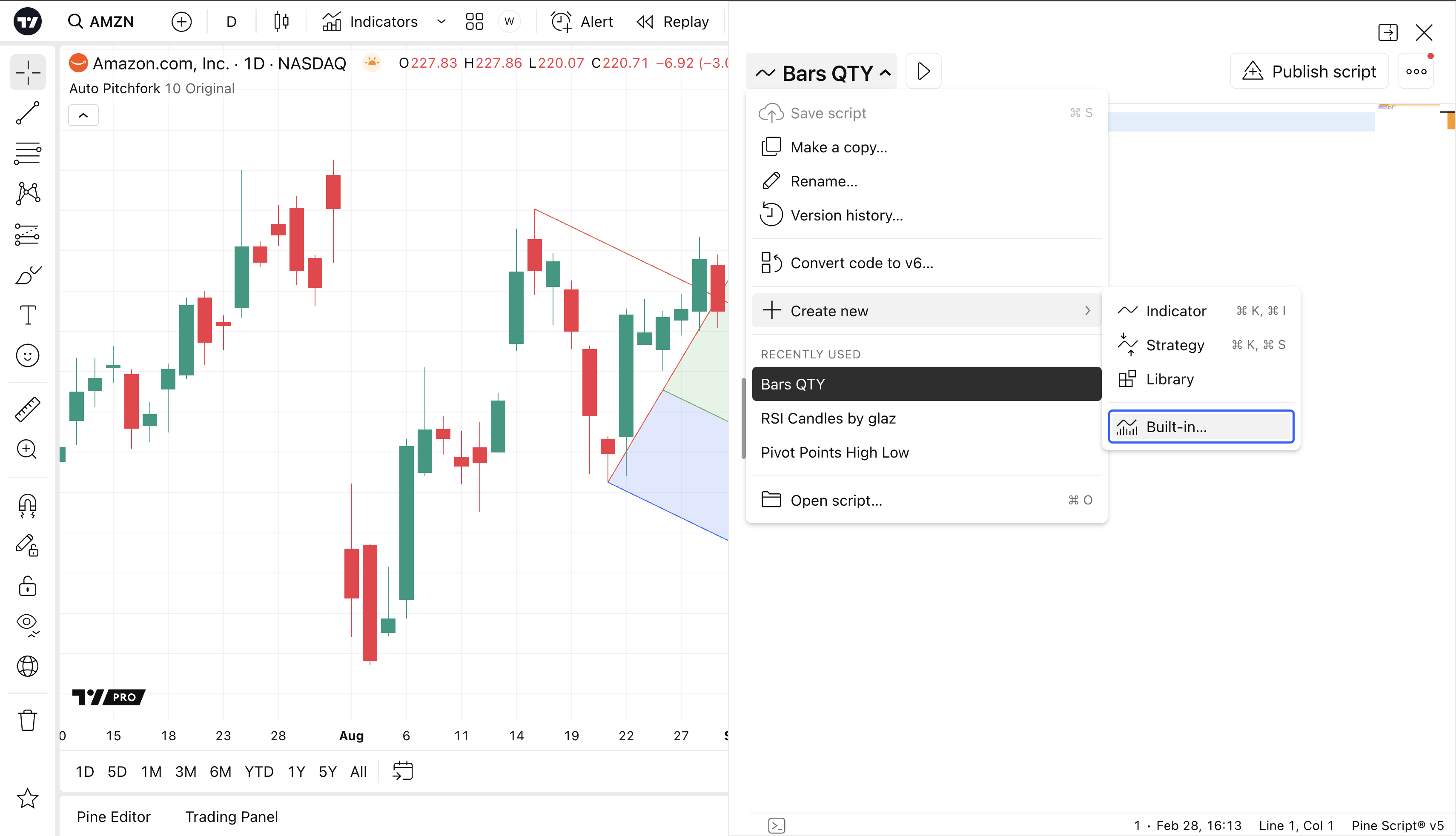 The indicator is written in Pine Script and its source code can be accessed, copied and modified. You can access it from the Source code icon to the right of the indicator's name on the chart, or from the Pine Editor, by using the Open button, then clicking on New default built-in script… and finding Auto Pitchfork in the menu there.