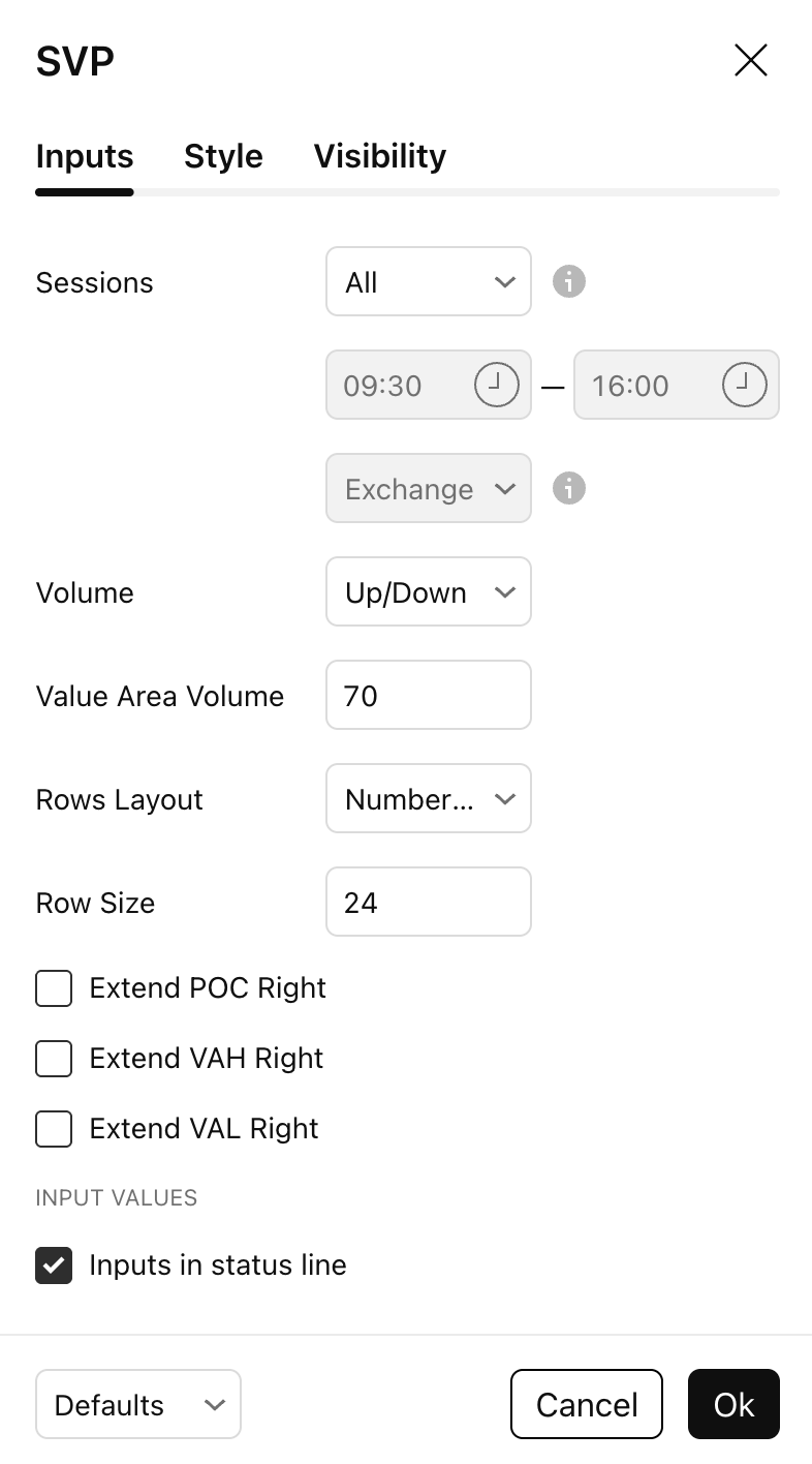 - Pre-market, Market, Post-market.With the dedicated "Pre-market", "Market" and "Post-market" options, the indicator will only build one volume profile per trading day, based on the trades for the specified session period. These settings should be used only on charts with extended hours. If there is no extended hours data on the chart or if the Extended Hours display is turned off, the indicator will not be able to build a volume profile for pre- or post-market.