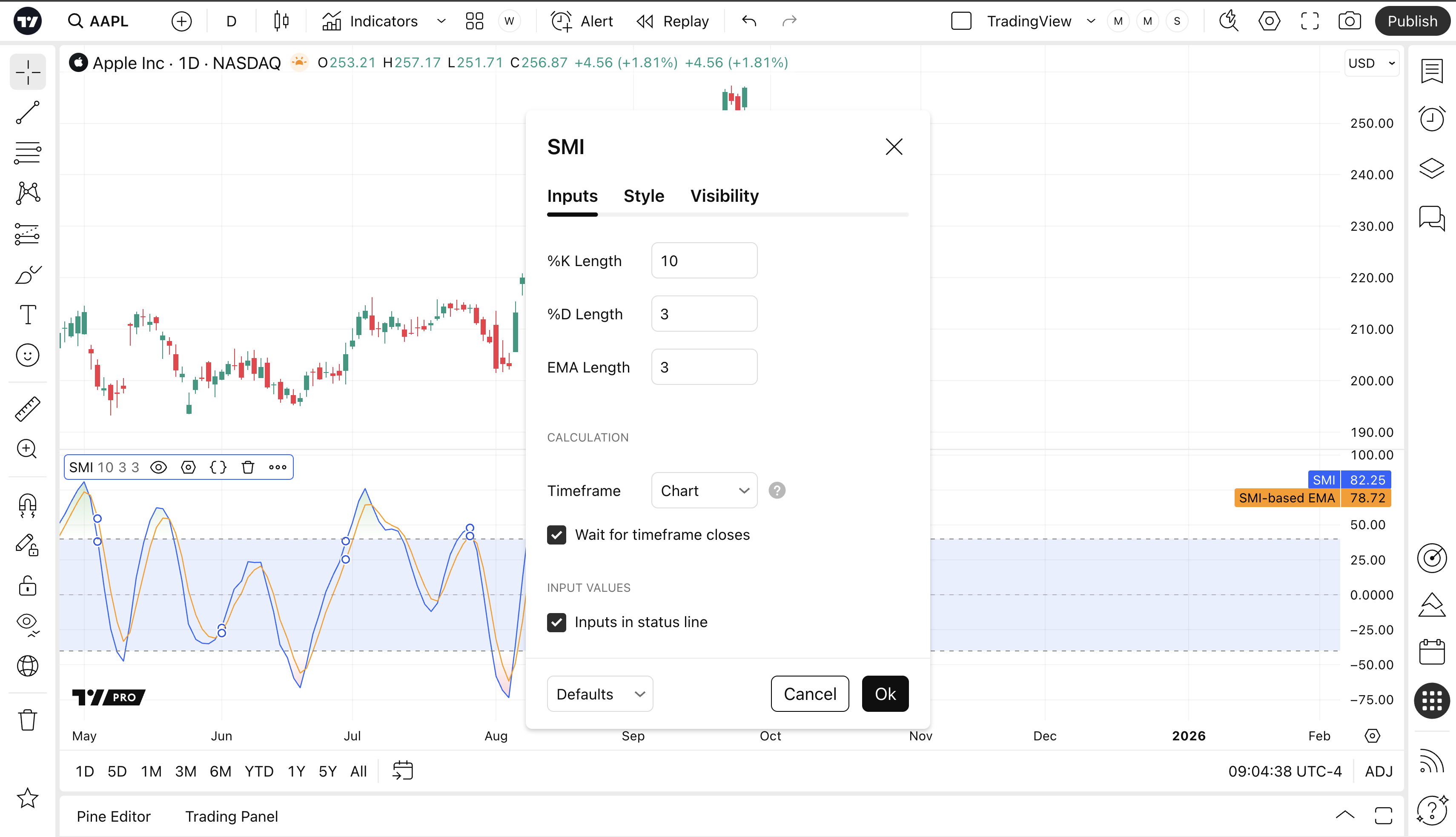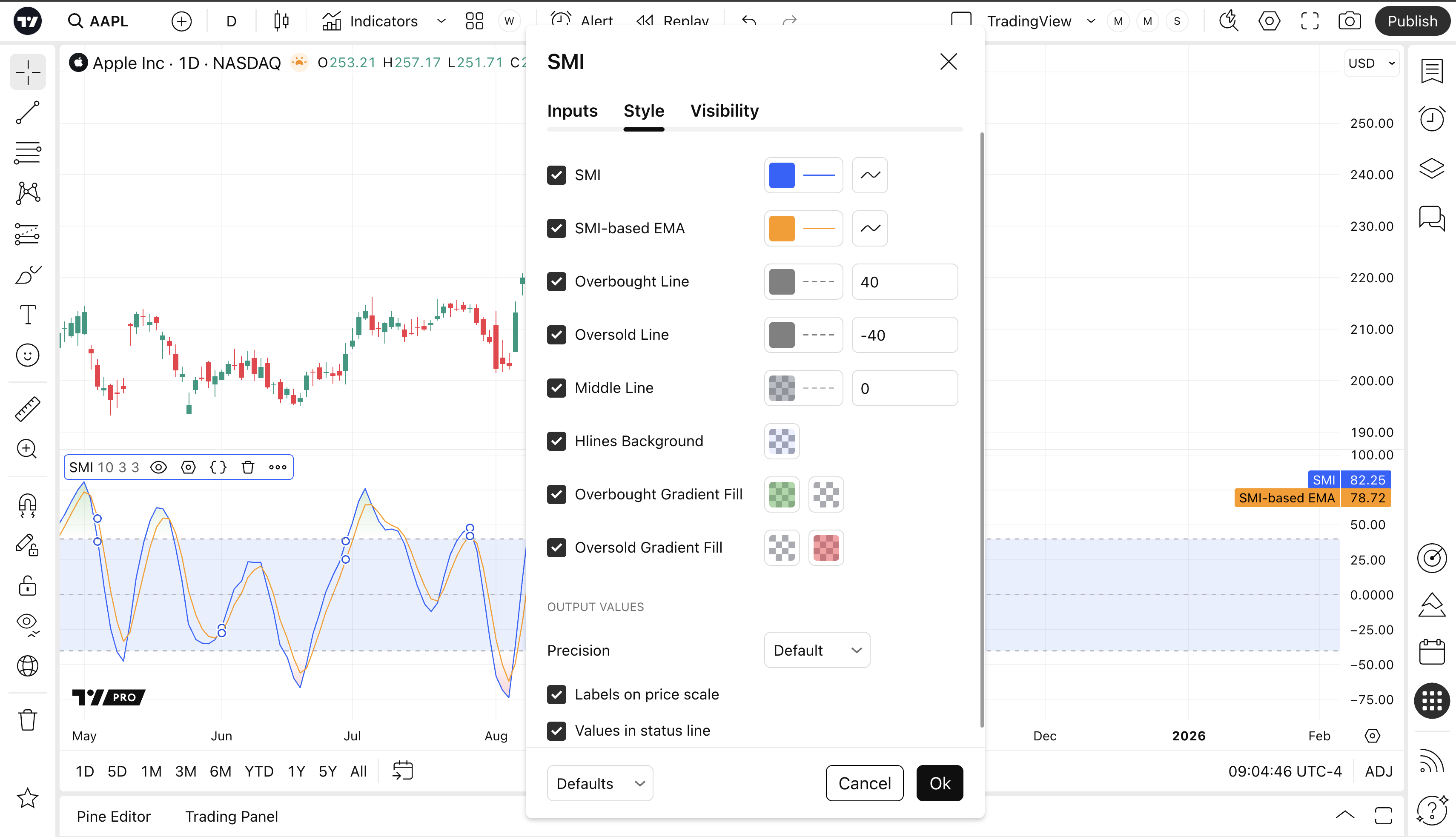 Can toggle the visibility of the SMI as well as the visibility of a price line showing the actual current price of the SMI. Can also select the SMI's color, line thickness, and line style.