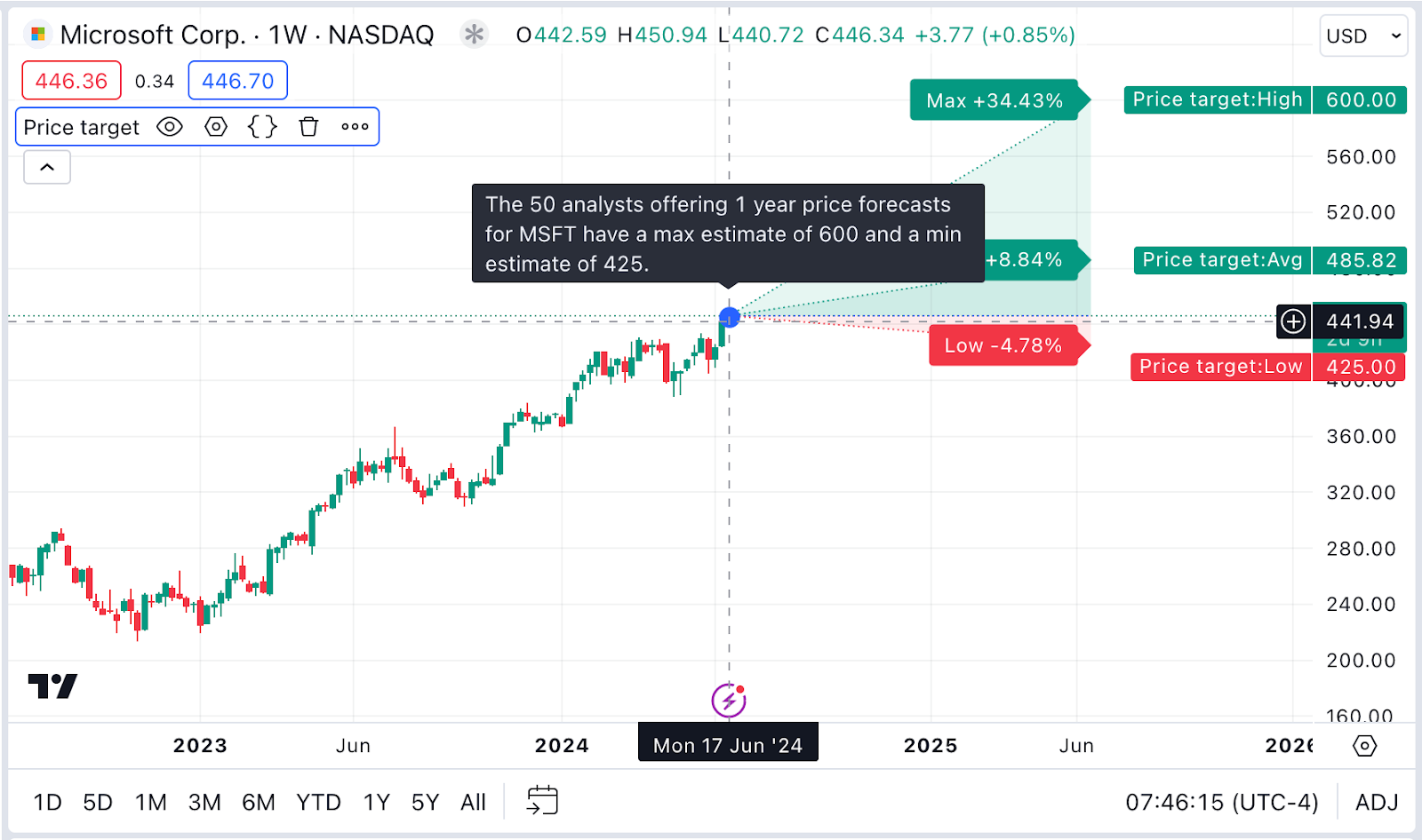 The Price target indicator displays predictions for the price of the current symbol in a year’s time. The values are based on price predictions by various analysts, which our financial data supplier provides to us. The Forecast section of the symbol page shows the same data, if it is available.