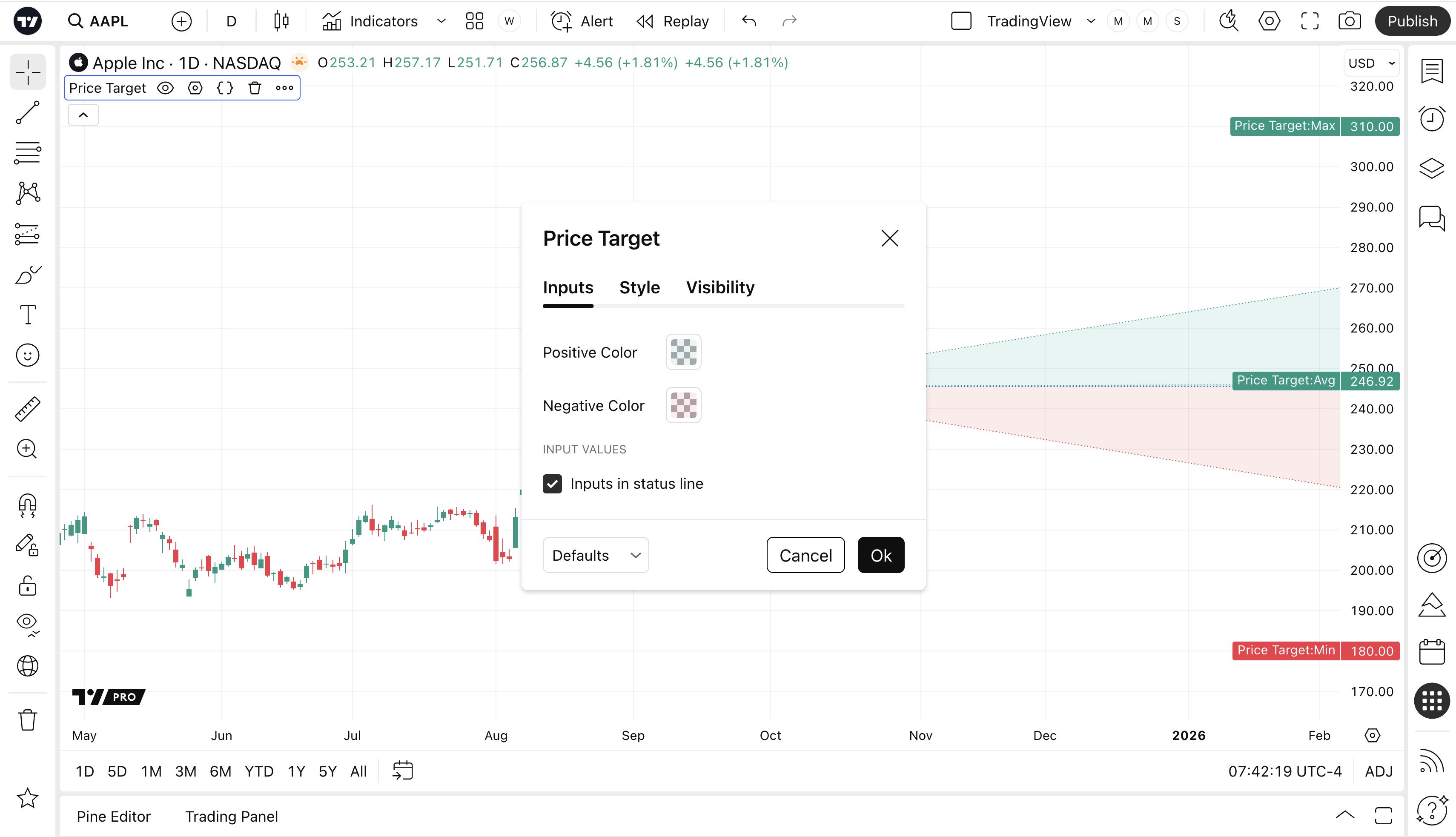 The colors for the lines, labels, and fills. If the predicted price is above the closing price of the symbol on the day that the prediction was made, then the drawings use the positive color. If the price is below the close, they use the negative color.