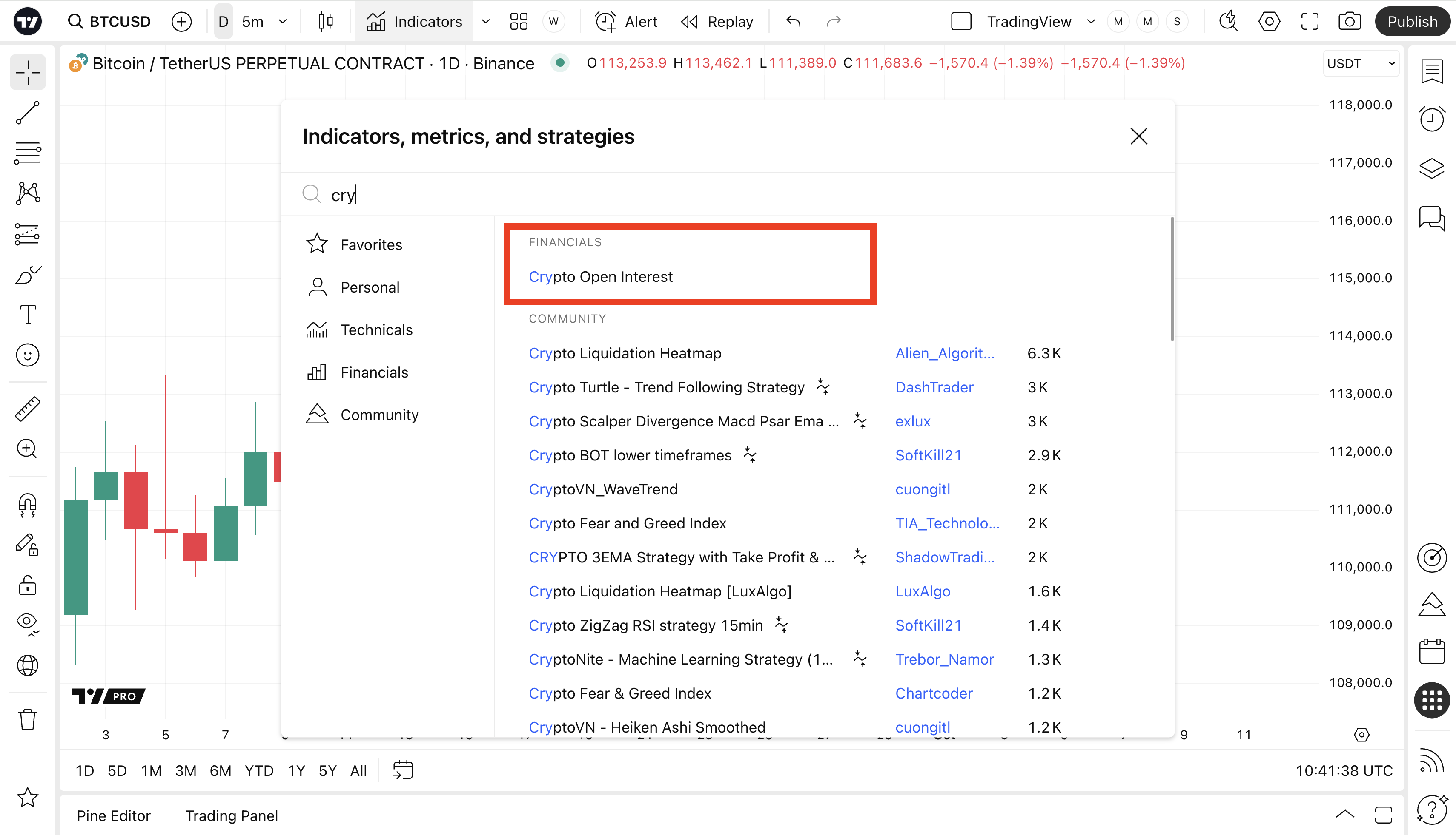 On the chart, open interest data for crypto derivatives is available as the "Crypto Open Interest" indicator in the "Financials" tab: