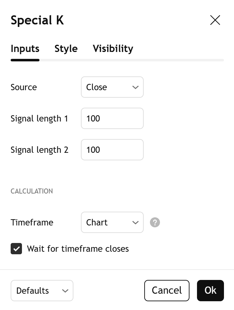 The result is a composite oscillator representing a weighted combination of significant market cycles with reduced noise. The indicator also includes a twice-smoothed signal line for detecting reversals. By default, it calculates the 100-bar SMA of the Special K, then applies a second 100-bar SMA to the result. You can customize the signal line's smoothing lengths from the "Inputs" tab of the indicator's settings.