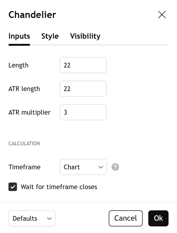 The Chandelier Exit indicator calculates two stop levels, one for long trades and the other for short trades, by finding the highest and lowest prices over a given lookback period, then adding and subtracting multiples of ATR. The formulas to calculate the exit levels are as follows:
