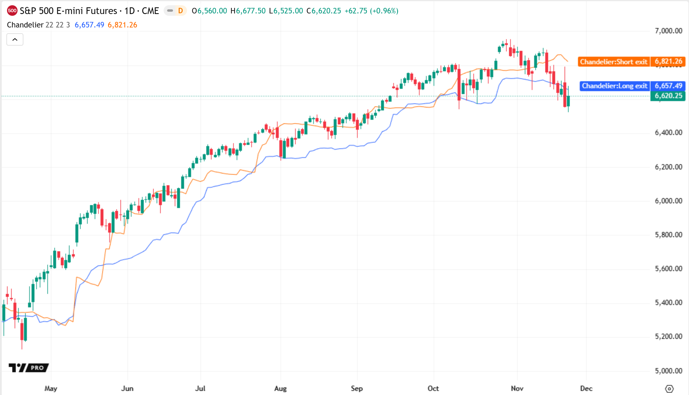 The objective of the Chandelier Exit indicator is to identify potential exit points based on significant price reversals after an established trend: