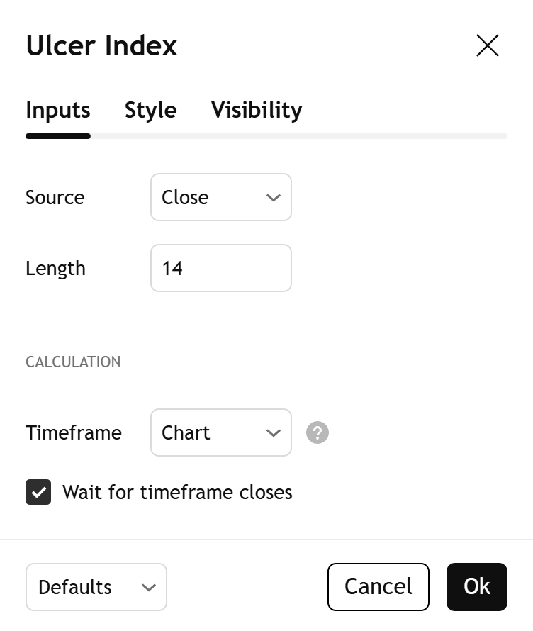 The Ulcer Index measures the root mean square of drawdowns in price from the highest value over a selected lookback period. The calculation is as follows: