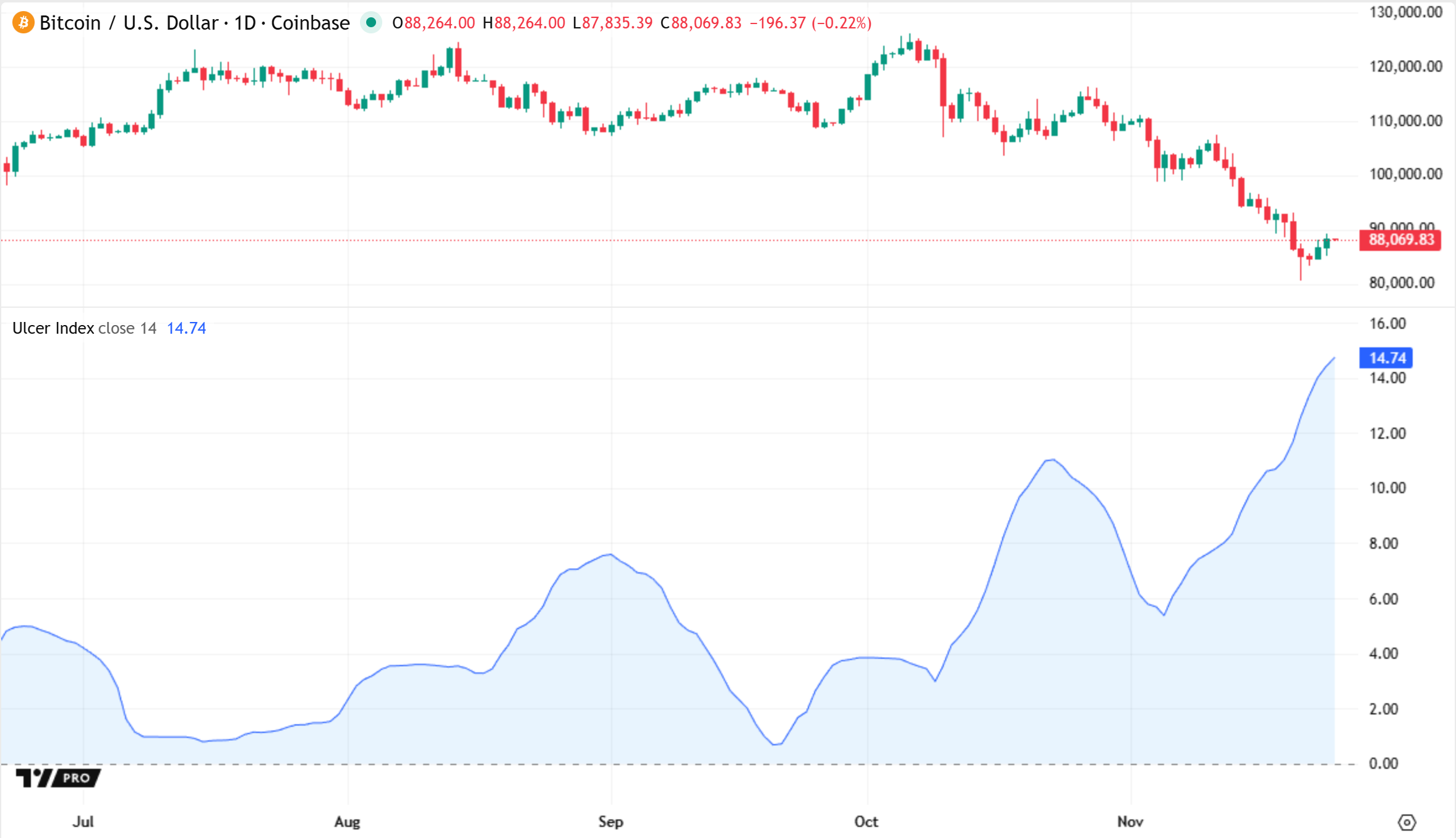 The Ulcer Index, devised by Peter Martin in 1987 and published by Peter Martin and Byron McCann in 1989, is a volatility indicator that estimates downside risk. It gauges the depth and duration of relative price declines from previous highs over a defined lookback period. The indicator's name stems from the idea that price drops cause stress for most traders, stress being associated with stomach ulcers.