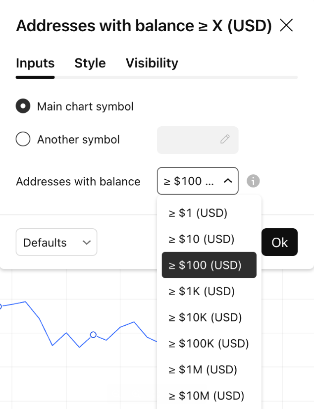 Addresses with balance ≥ X (USD) is calculated by counting unique addresses where (balance × current USD price) ≥ X. Users can adjust the X parameter in the indicator settings to analyze different economic holder tiers.