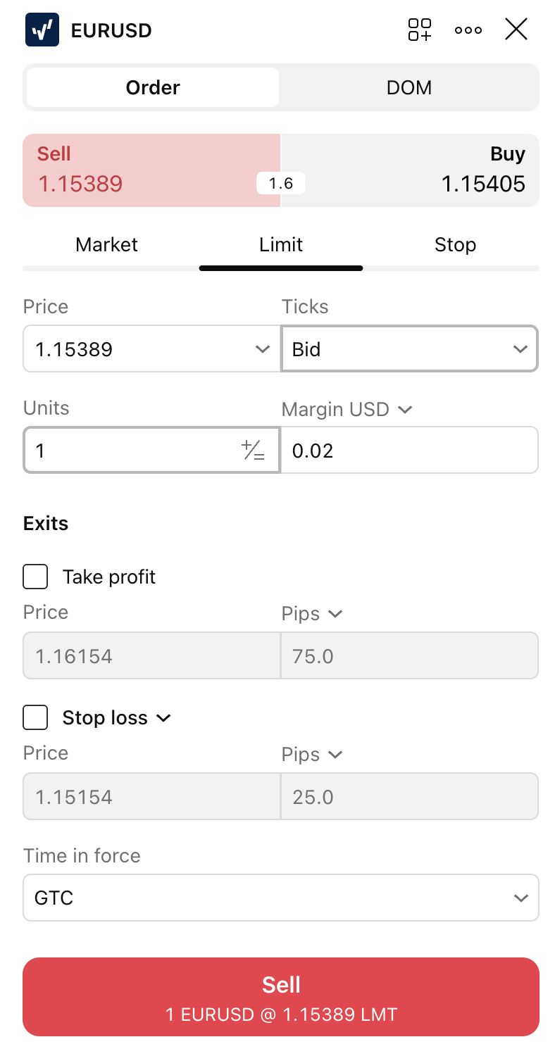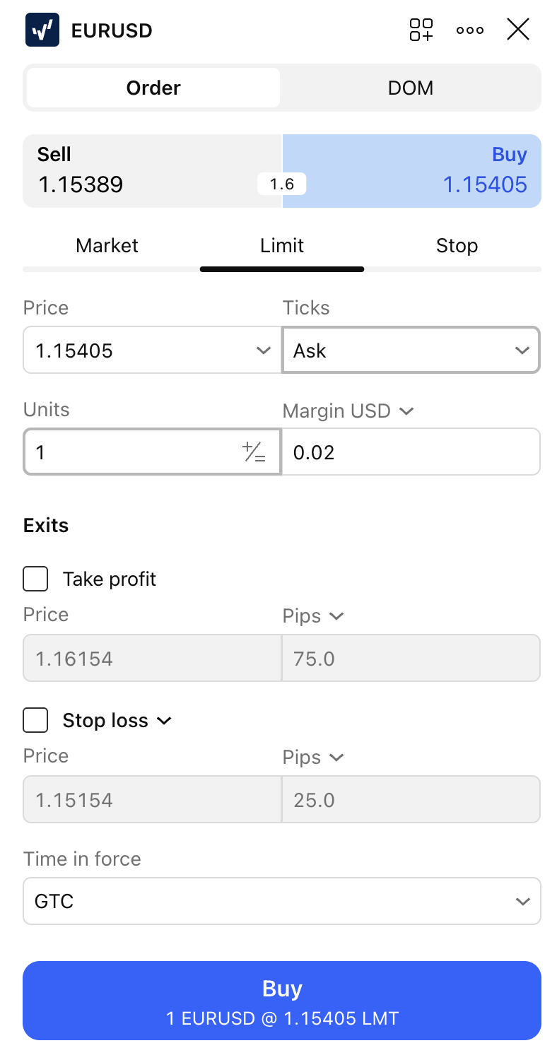 - In the order ticket window, you can define a number of units to buy or sell, switch between Market, Limit, or Stop orders, or assign Take Profit and Stop Loss.
