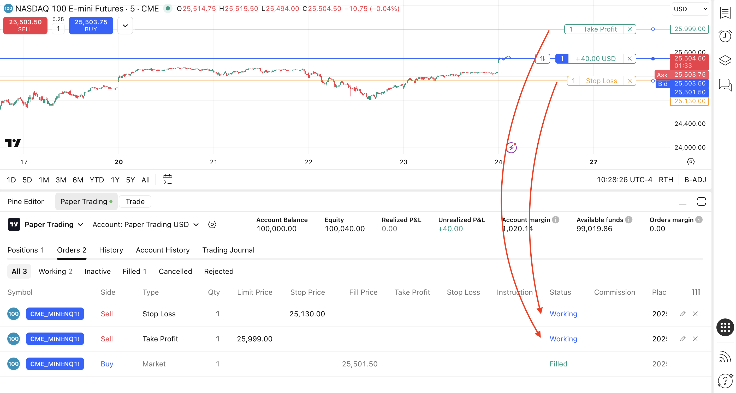 Once an Order turns into a position its status is “Filled” and its Levels are indicated as “Working”.
